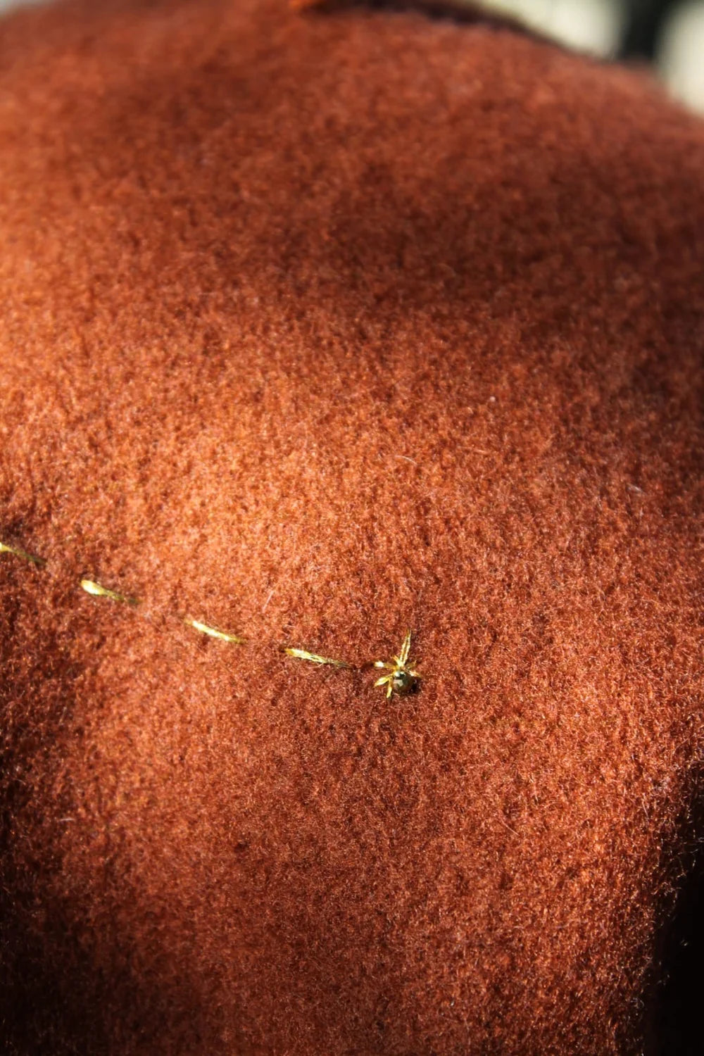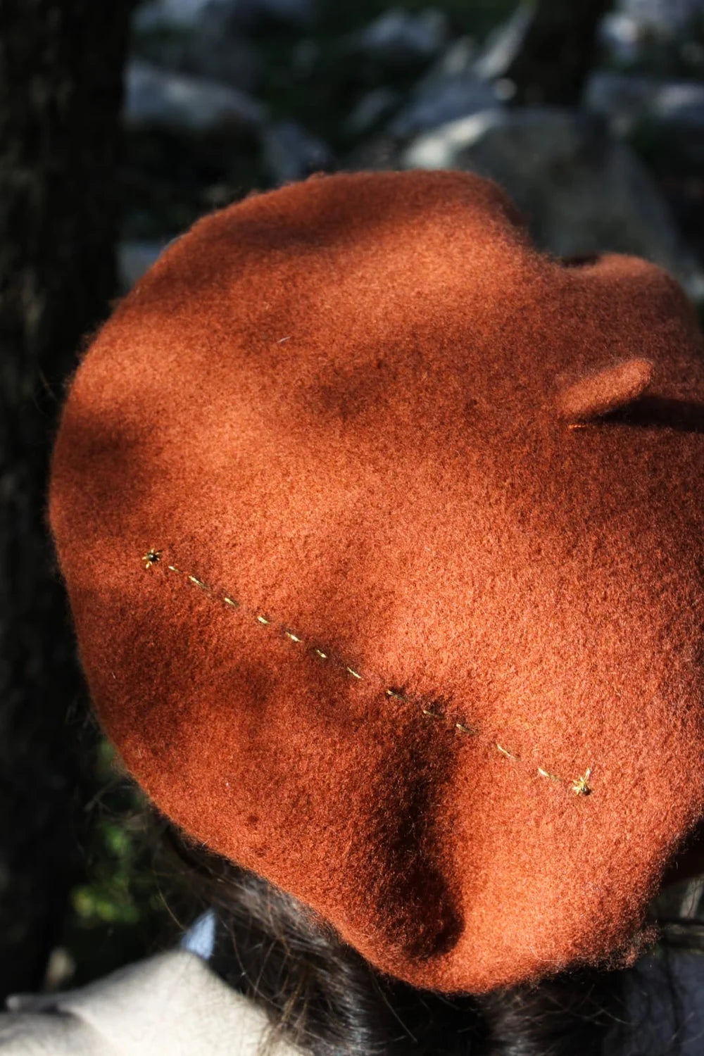 ベレー帽は100%ウール製で、金糸とビーズを手刺繍で施しています。刺繍は王家の星座を描いています。