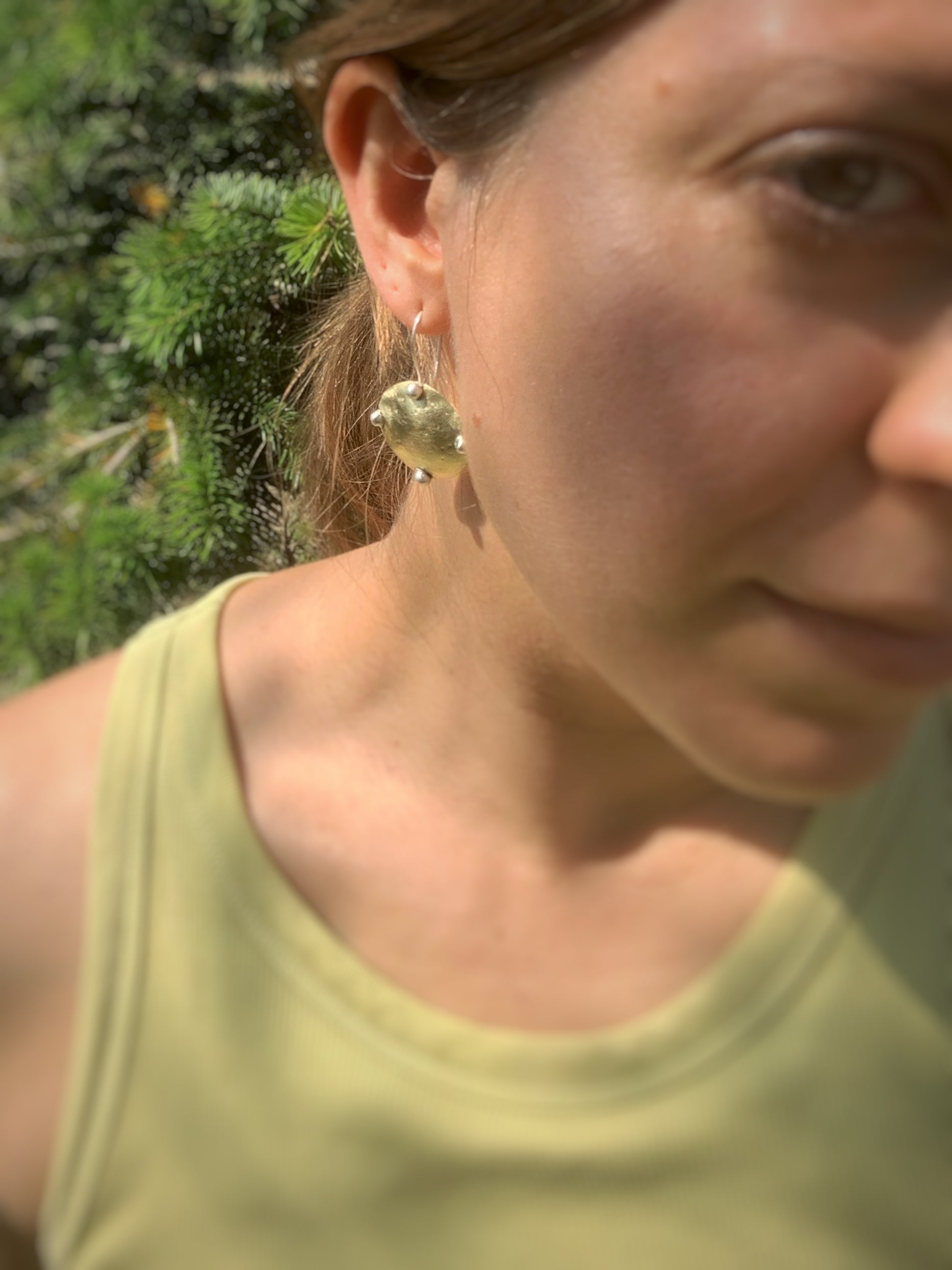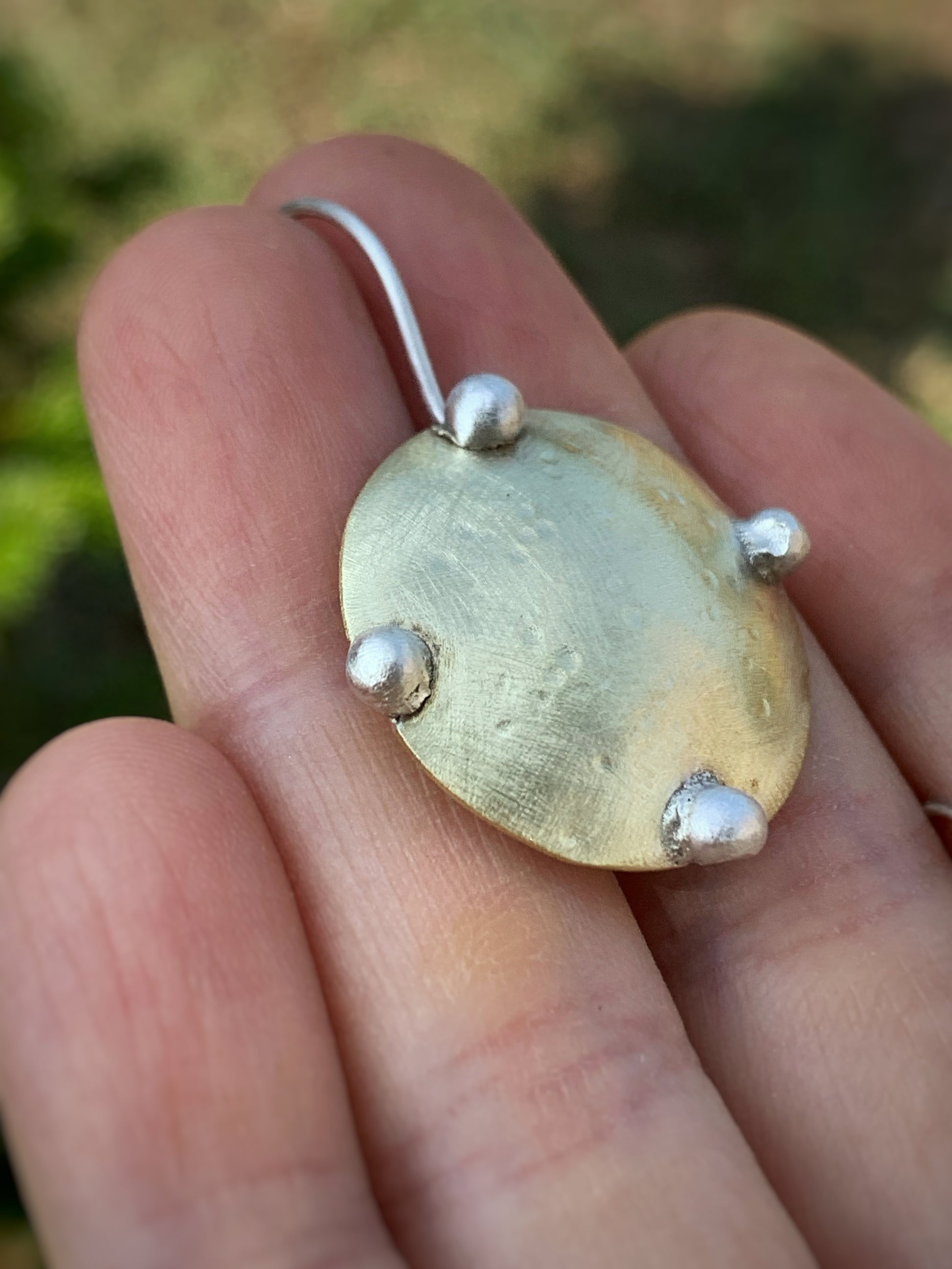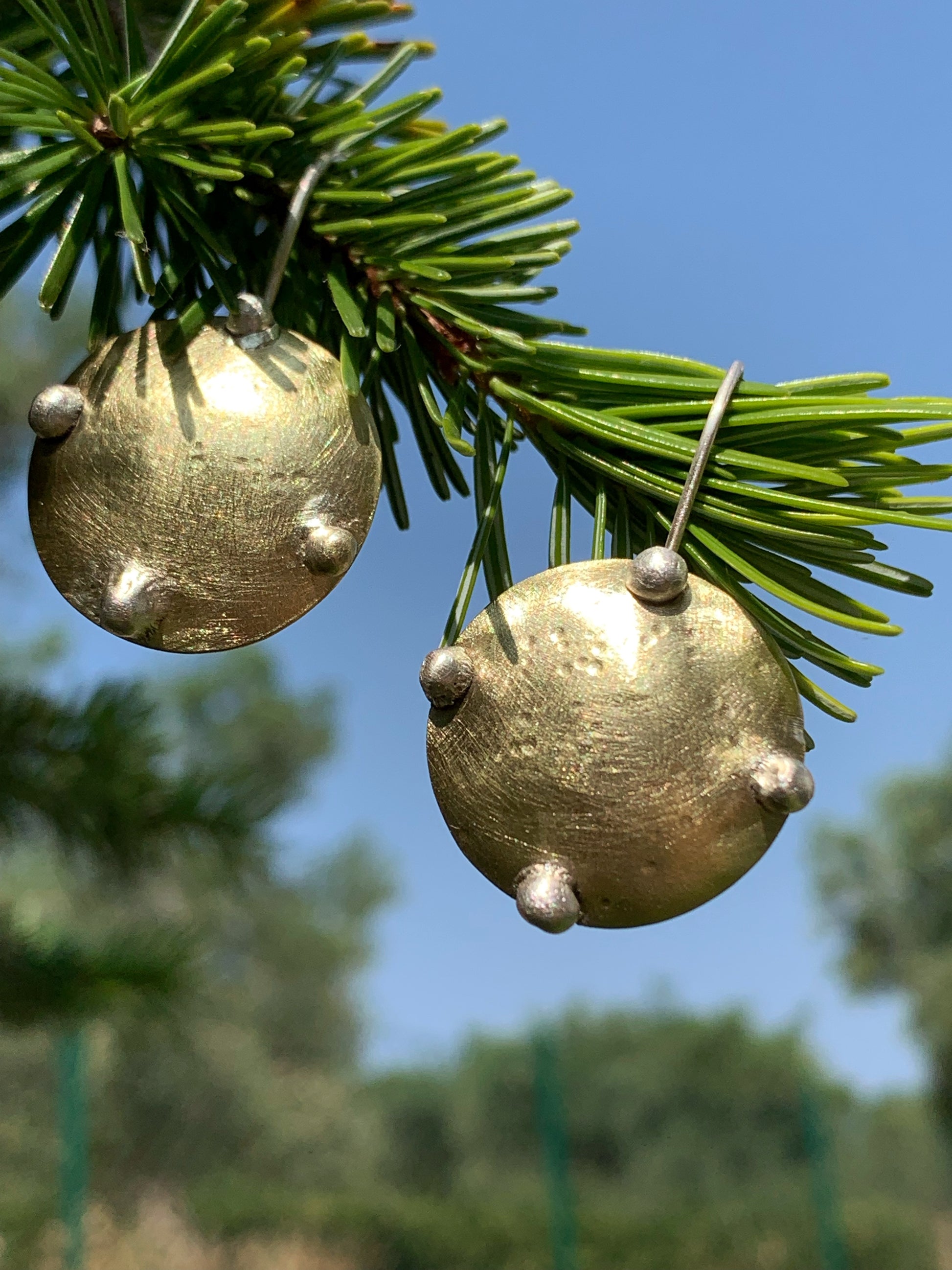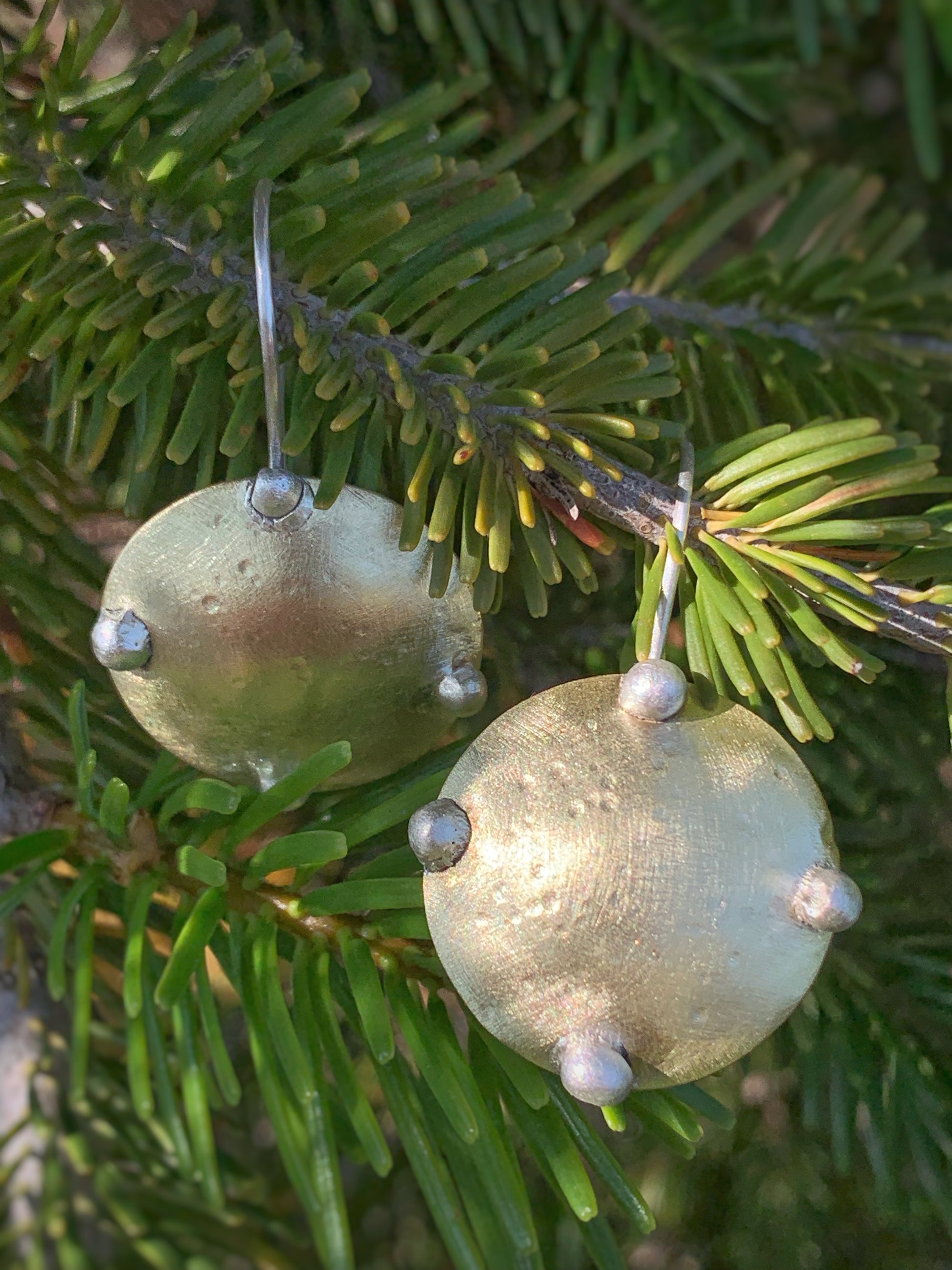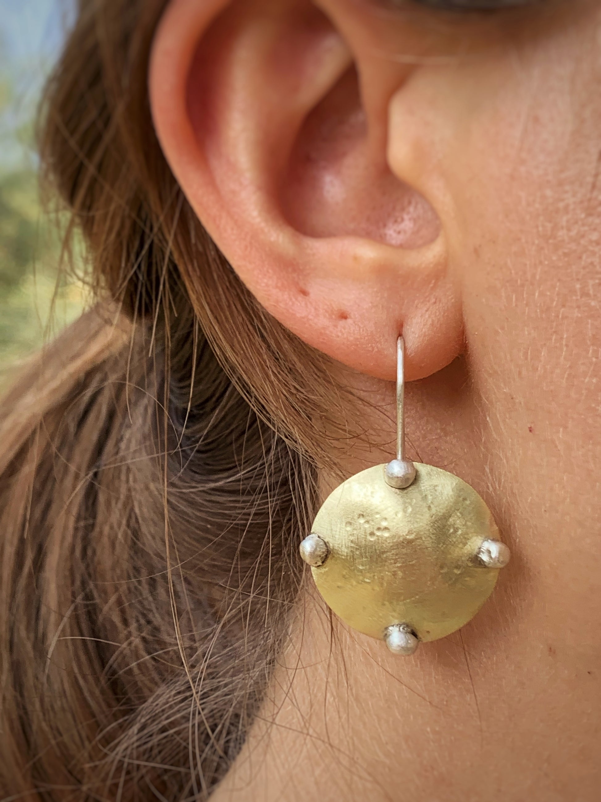 イヤリングペンダント(925シルバーのイヤリングワイヤー付き)はペアで販売されます。わずかにカーブした形状で、手打ちの槌目模様が施され、つや消しセミマット仕上げです。それぞれの円の直径は約2.5cmです。