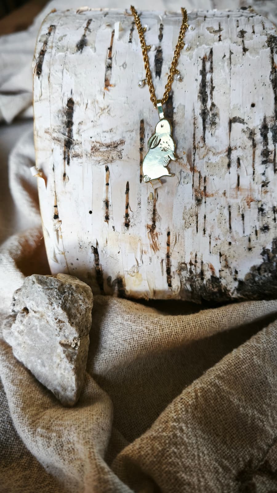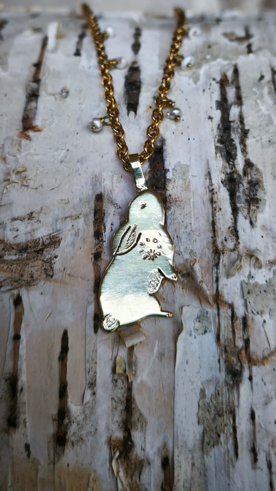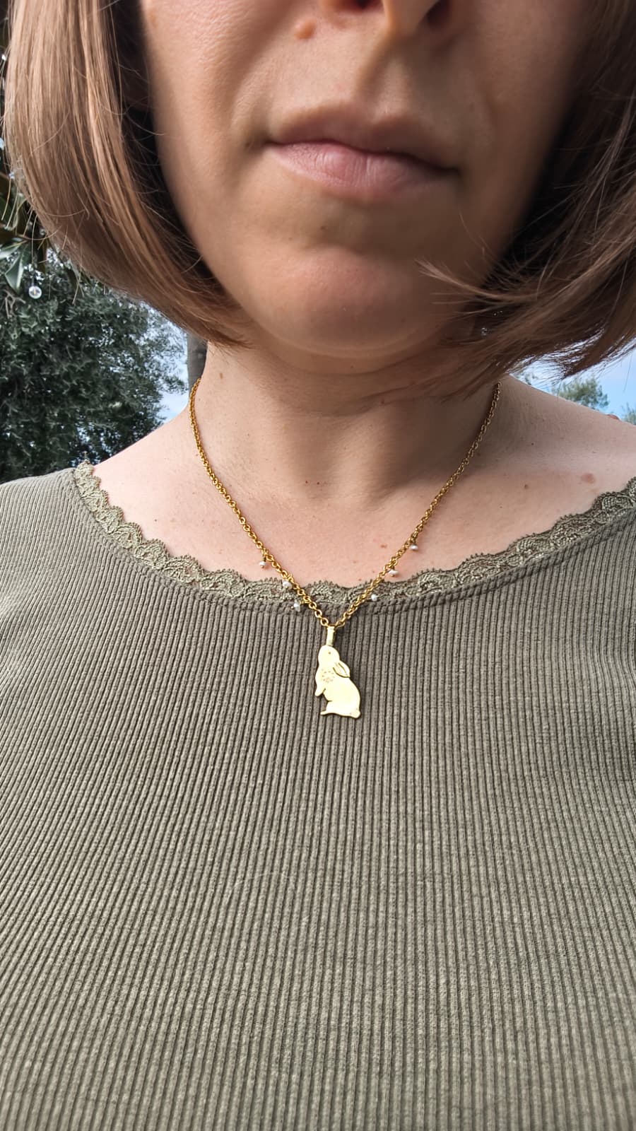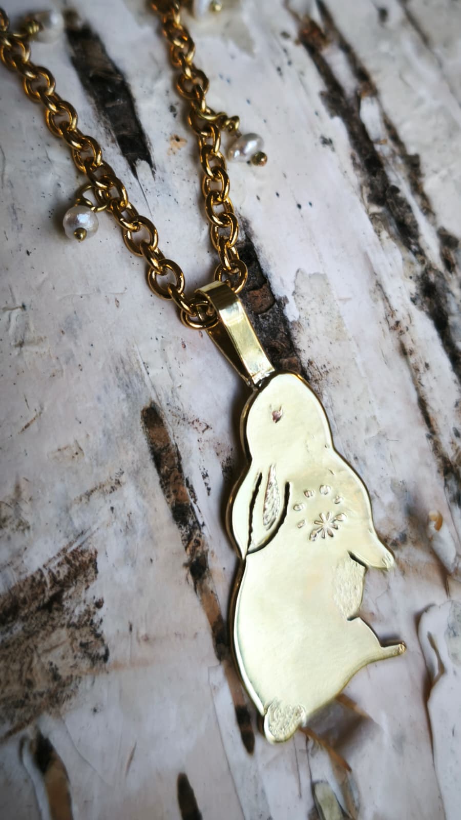 Ogni dettaglio è stato realizzato con tecniche orafe tradizionali: il coniglio è stato traforato, inciso e saldato a mano, mentre la catenina in acciaio dorato, arricchita da micro-perline naturali montate a mano singolarmente, aggiunge eleganza all’amuleto.