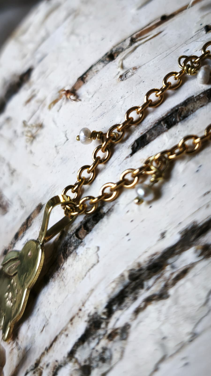Catenina: in acciaio dorato con micro-perline di fiume; lunghezza circa 45 cm