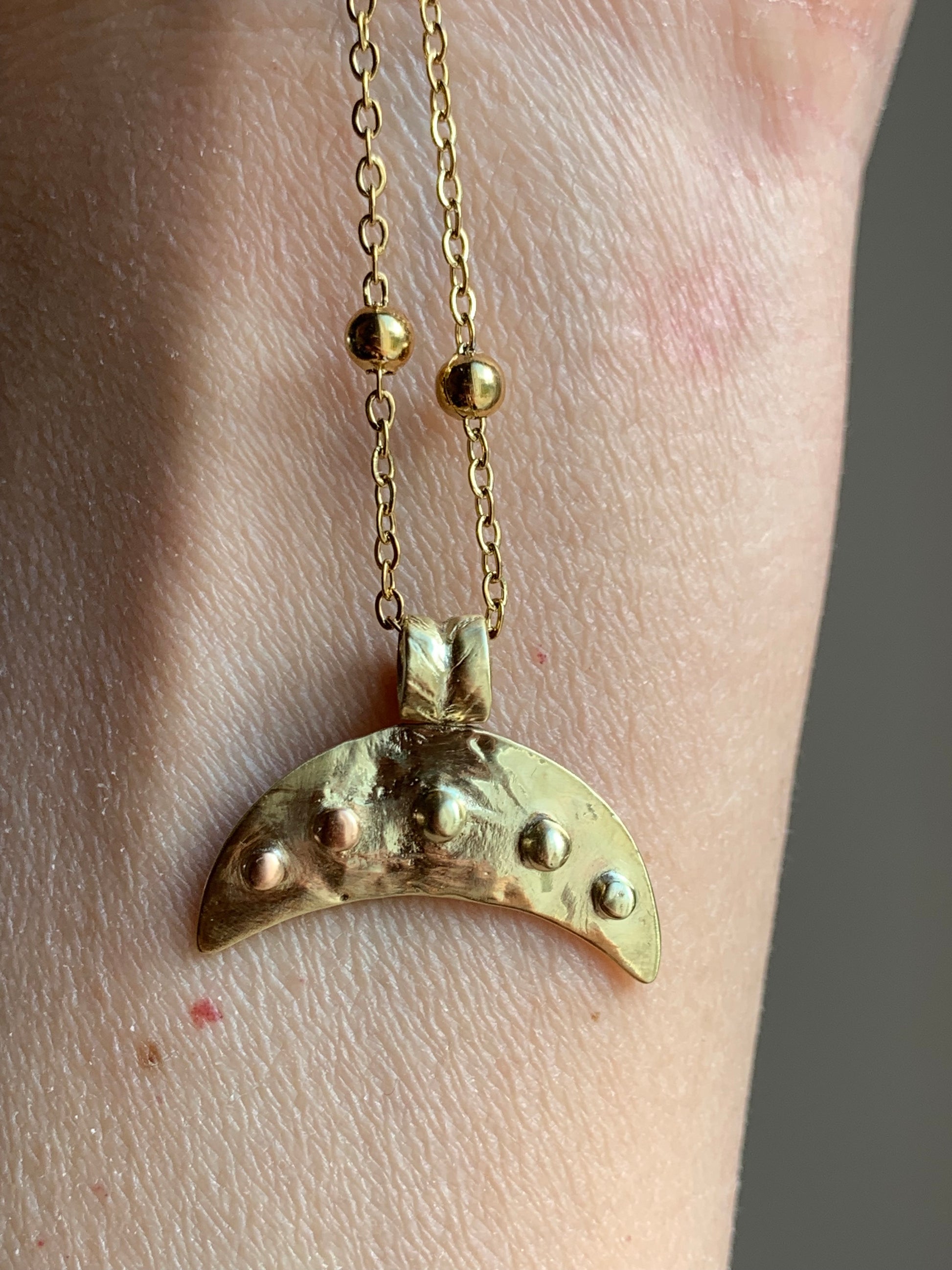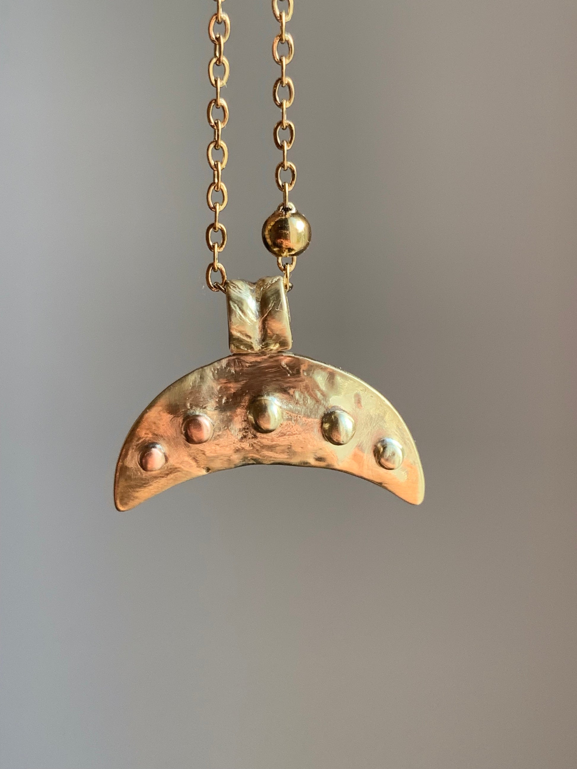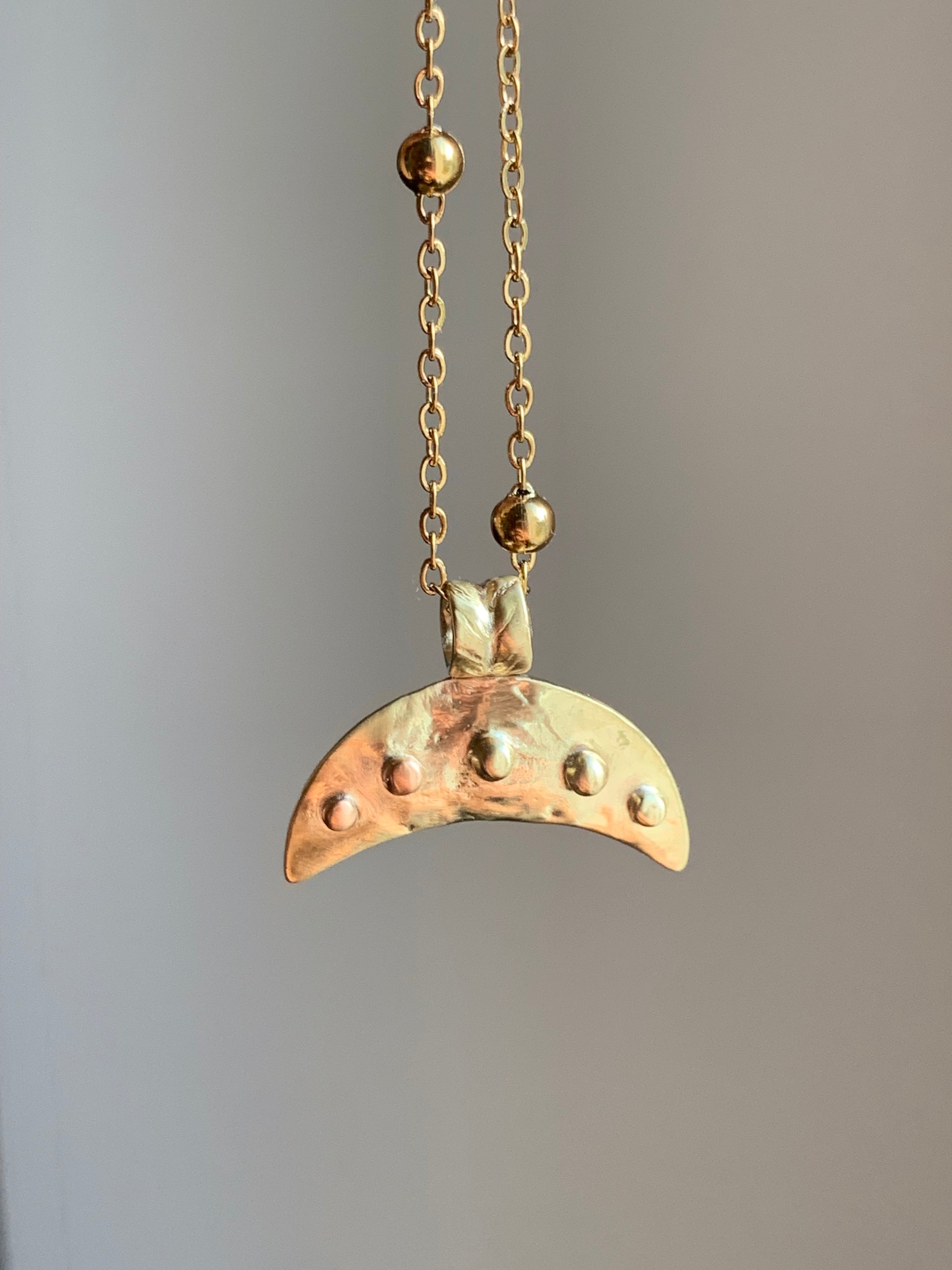Traforato e saldato a mano in ottone, questo ciondolo riprende la forma della "lunula", antico simbolo femminile usato fin dalla preistoria e in epoca romana come amuleto di protezione e connessione con il divino femminile.