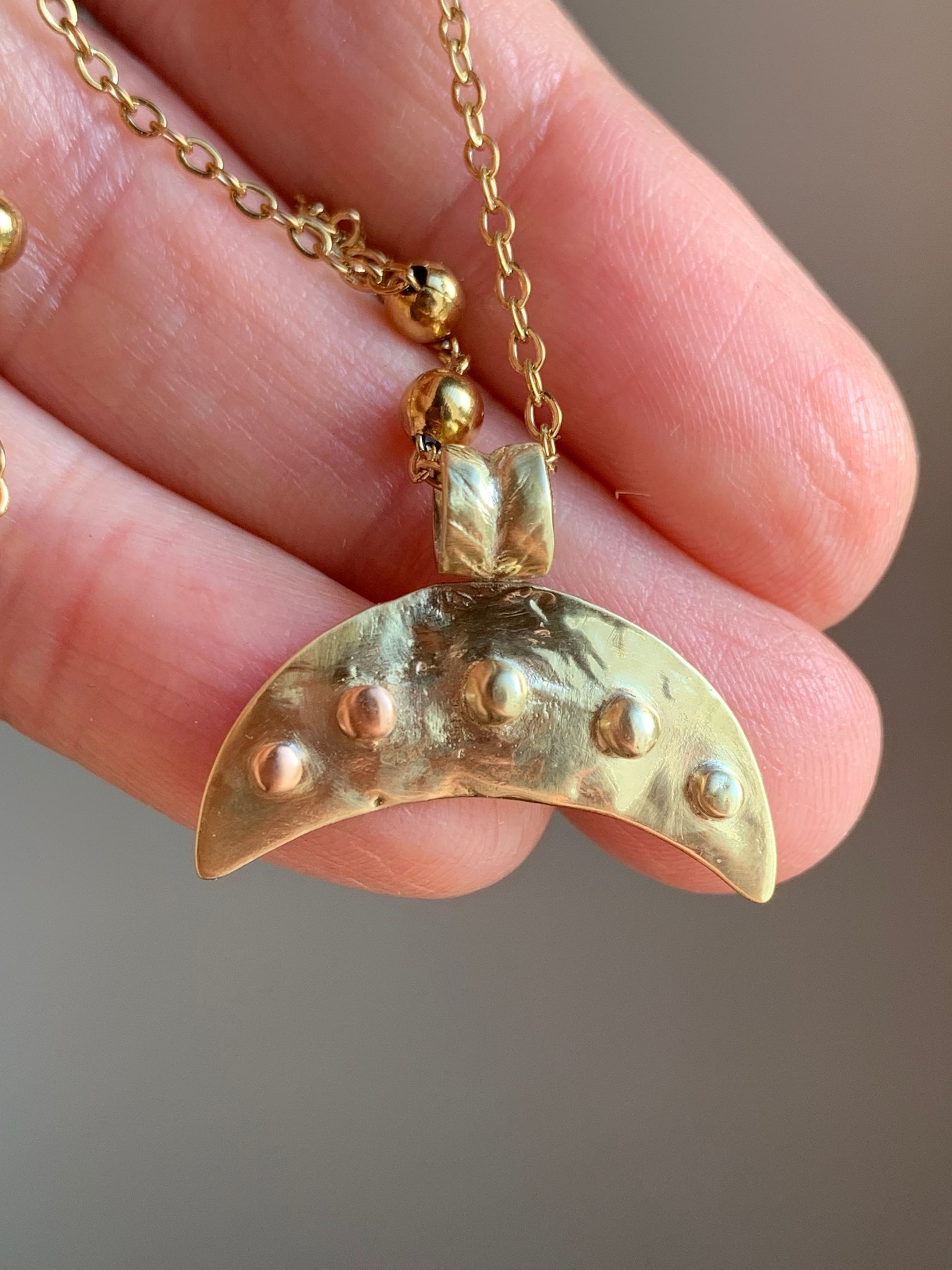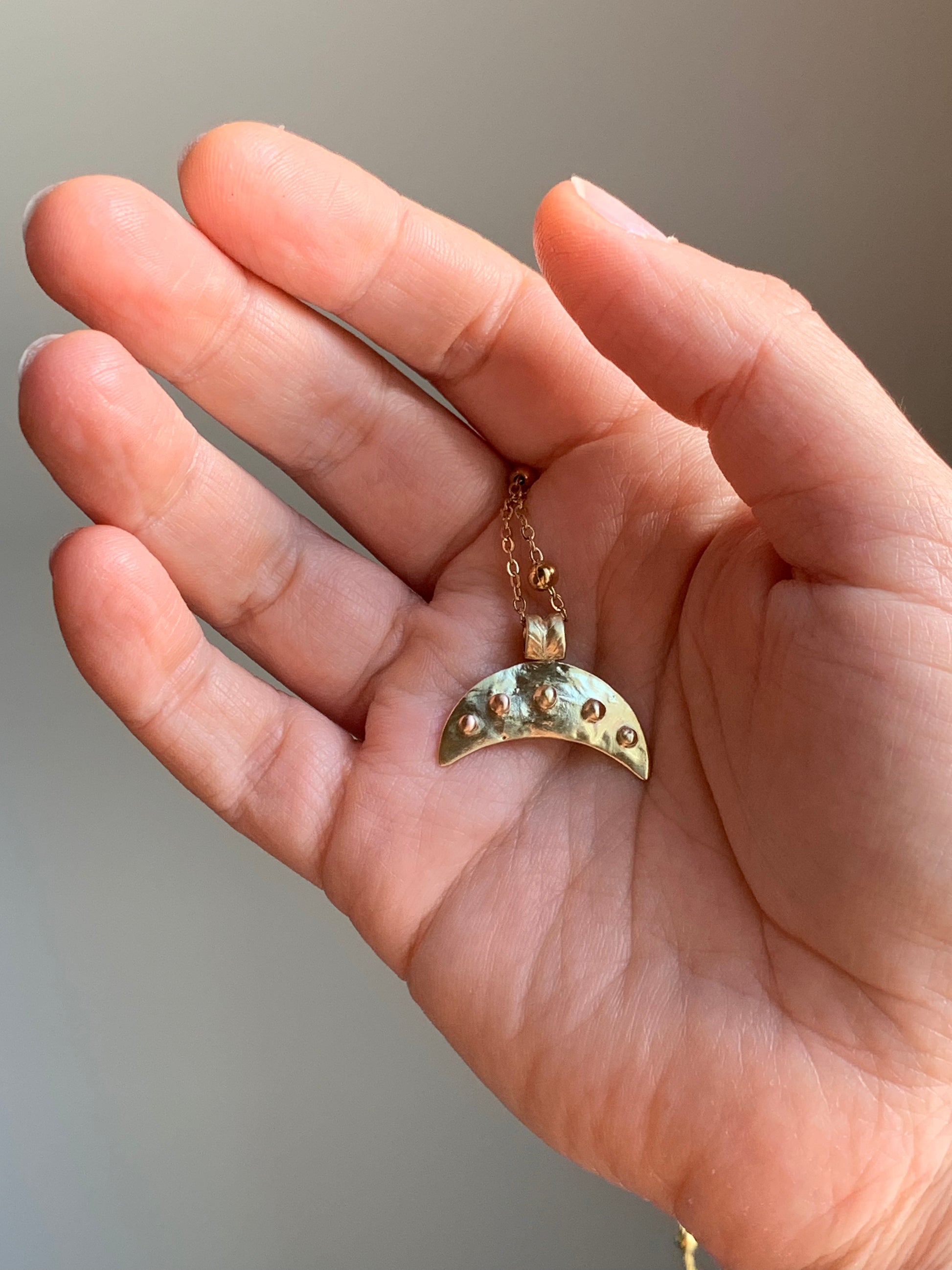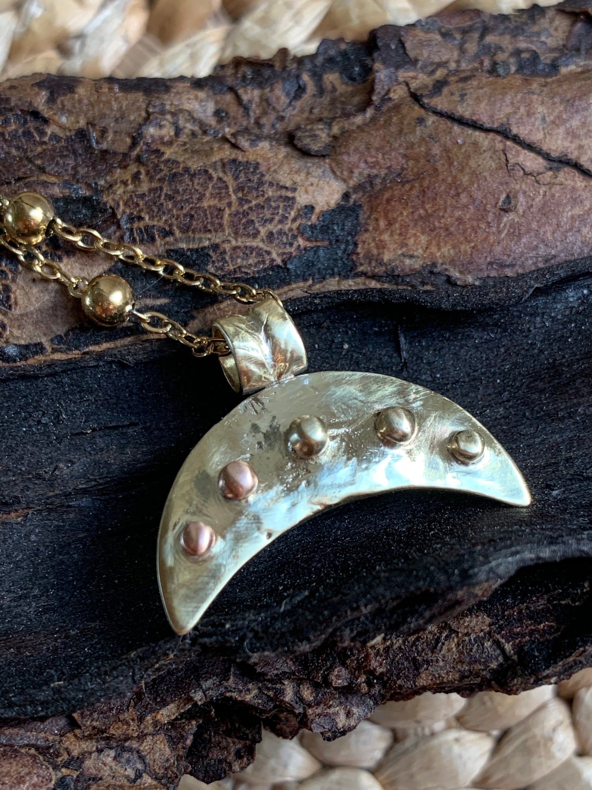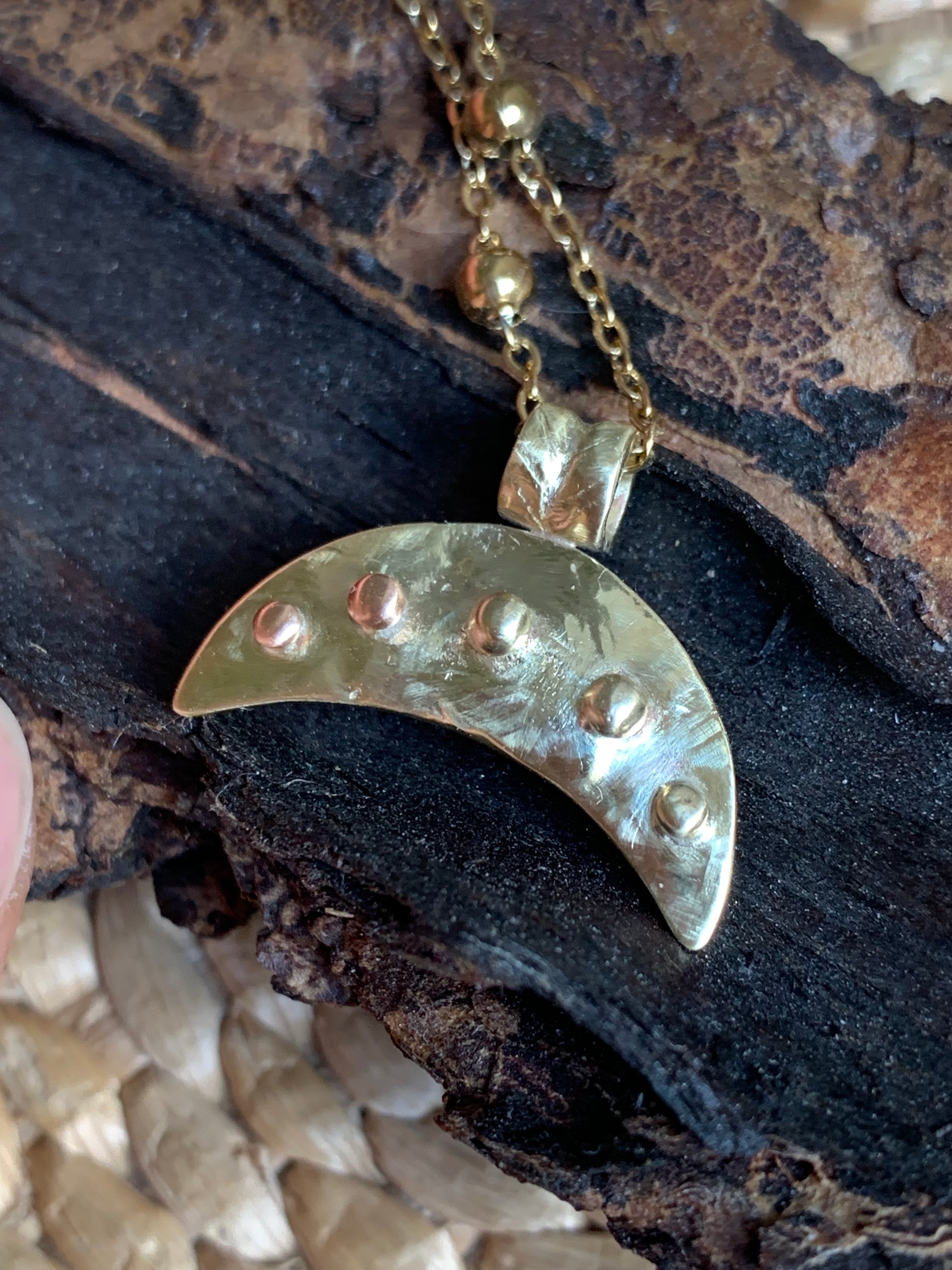 Traforato e saldato a mano in ottone, questo ciondolo riprende la forma della "lunula", antico simbolo femminile usato fin dalla preistoria e in epoca romana come amuleto di protezione e connessione con il divino femminile.