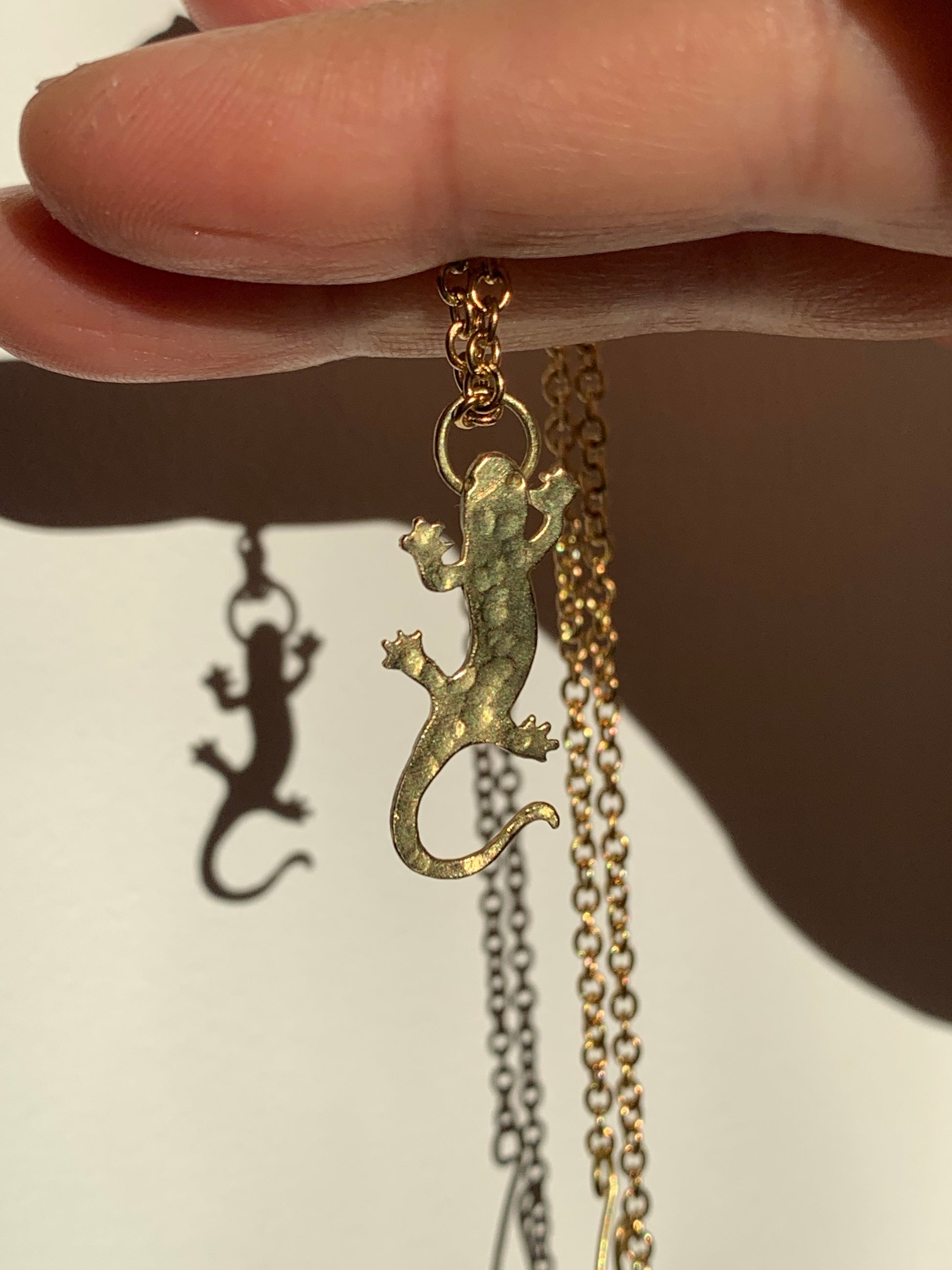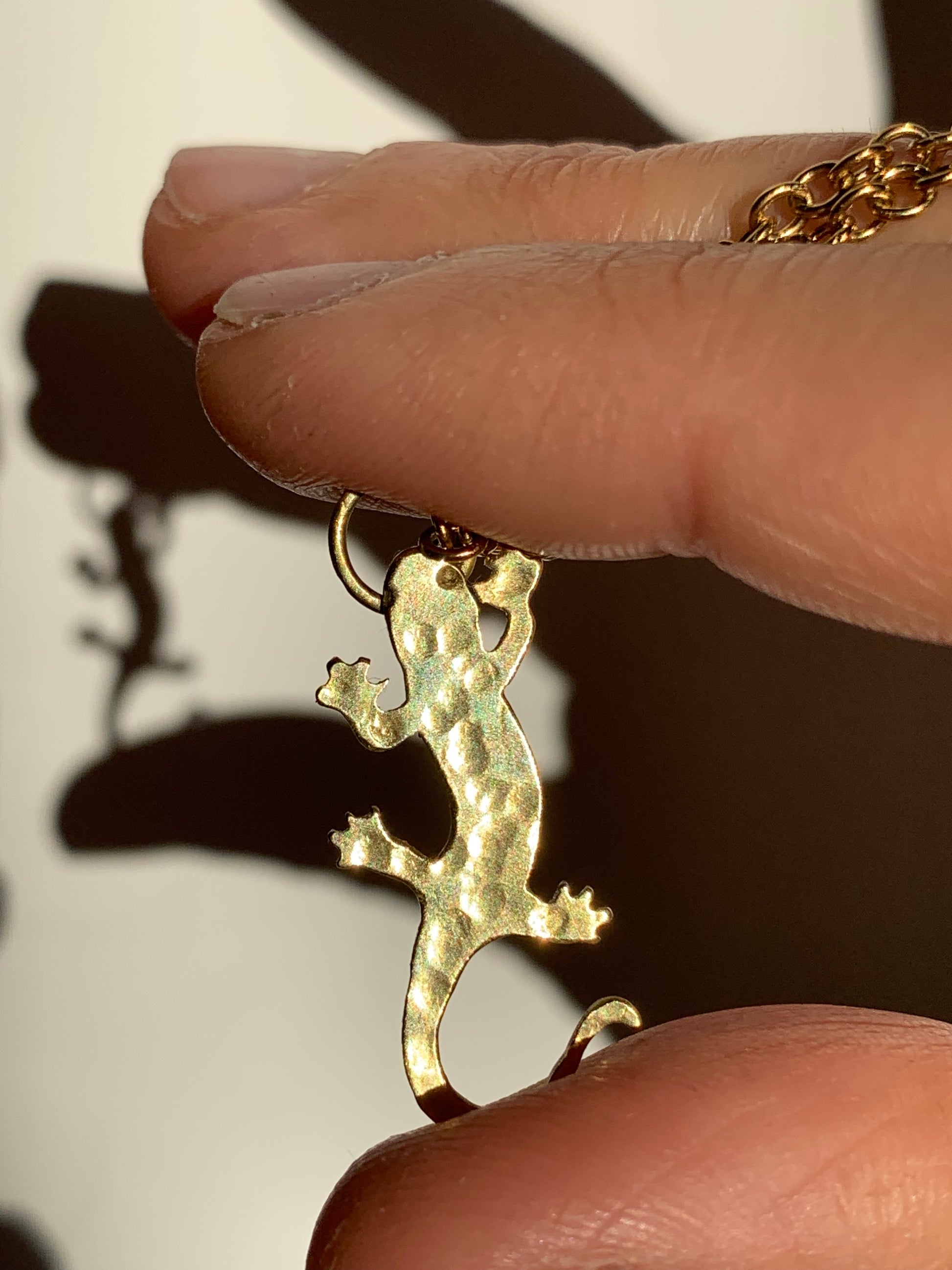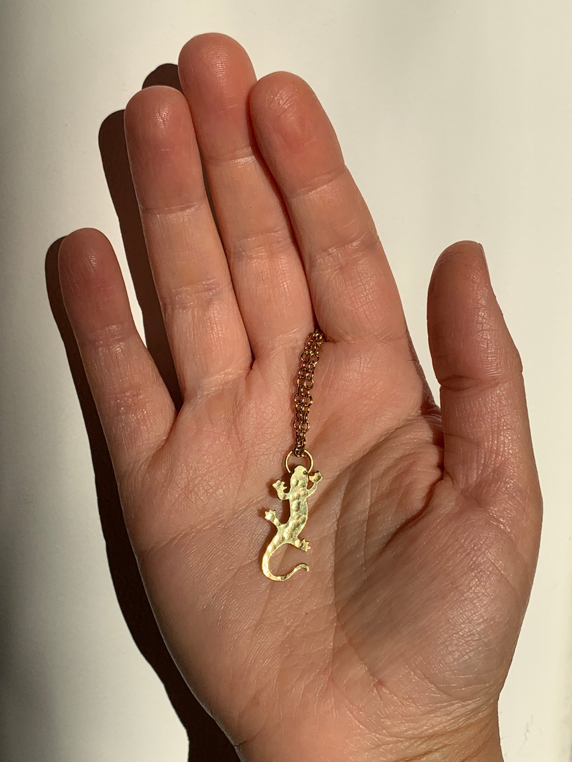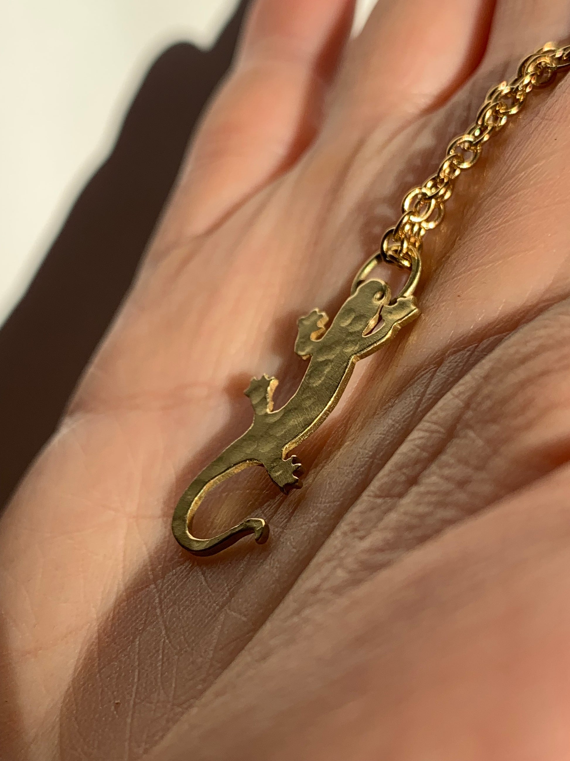 Martellato e traforato a mano in ottone, questo ciondolo racchiude l’essenza arcana della salamandra: creatura mitica che danza tra le fiamme senza bruciarsi.