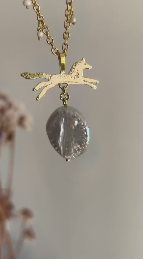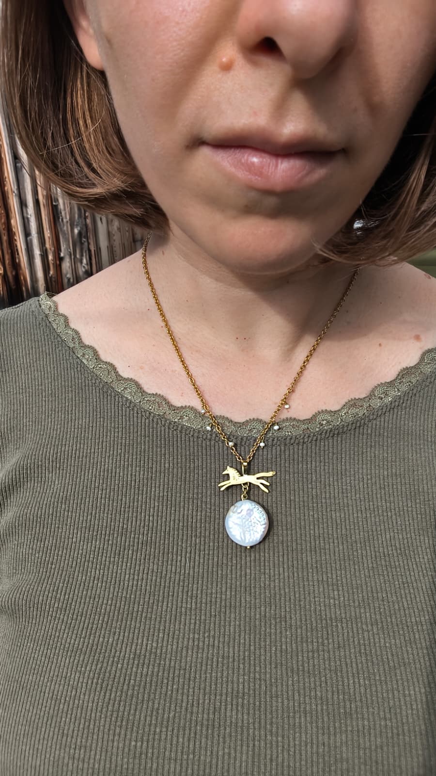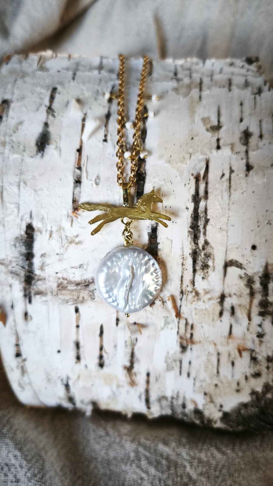 “Cavallino della Luna Piena” – Amuleto in Ottone e Perle di Fiume