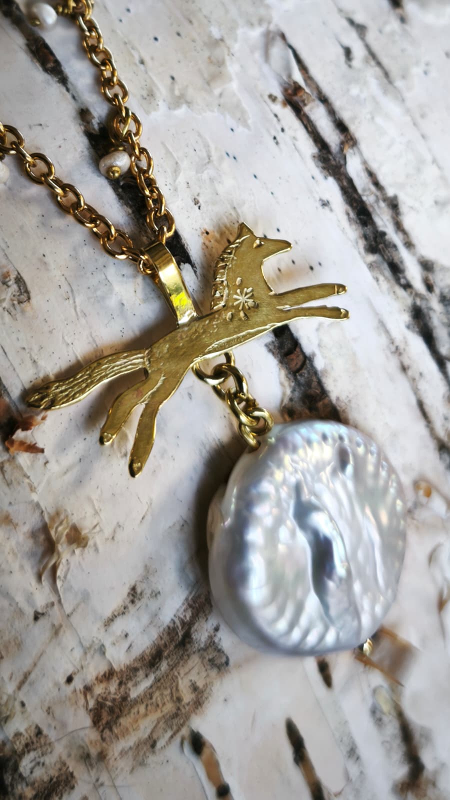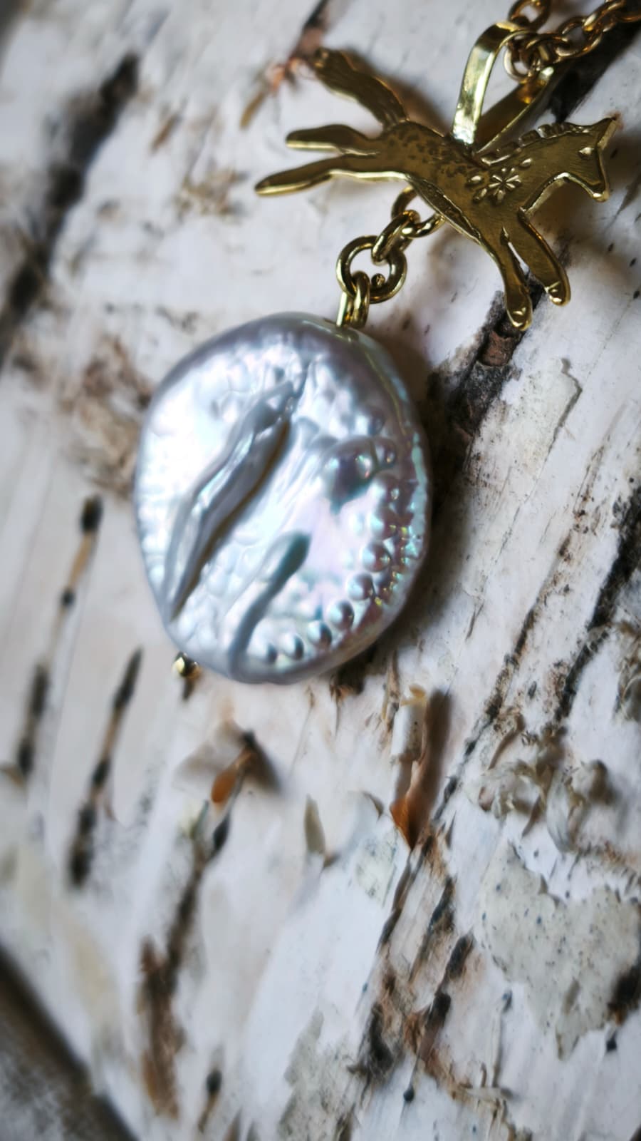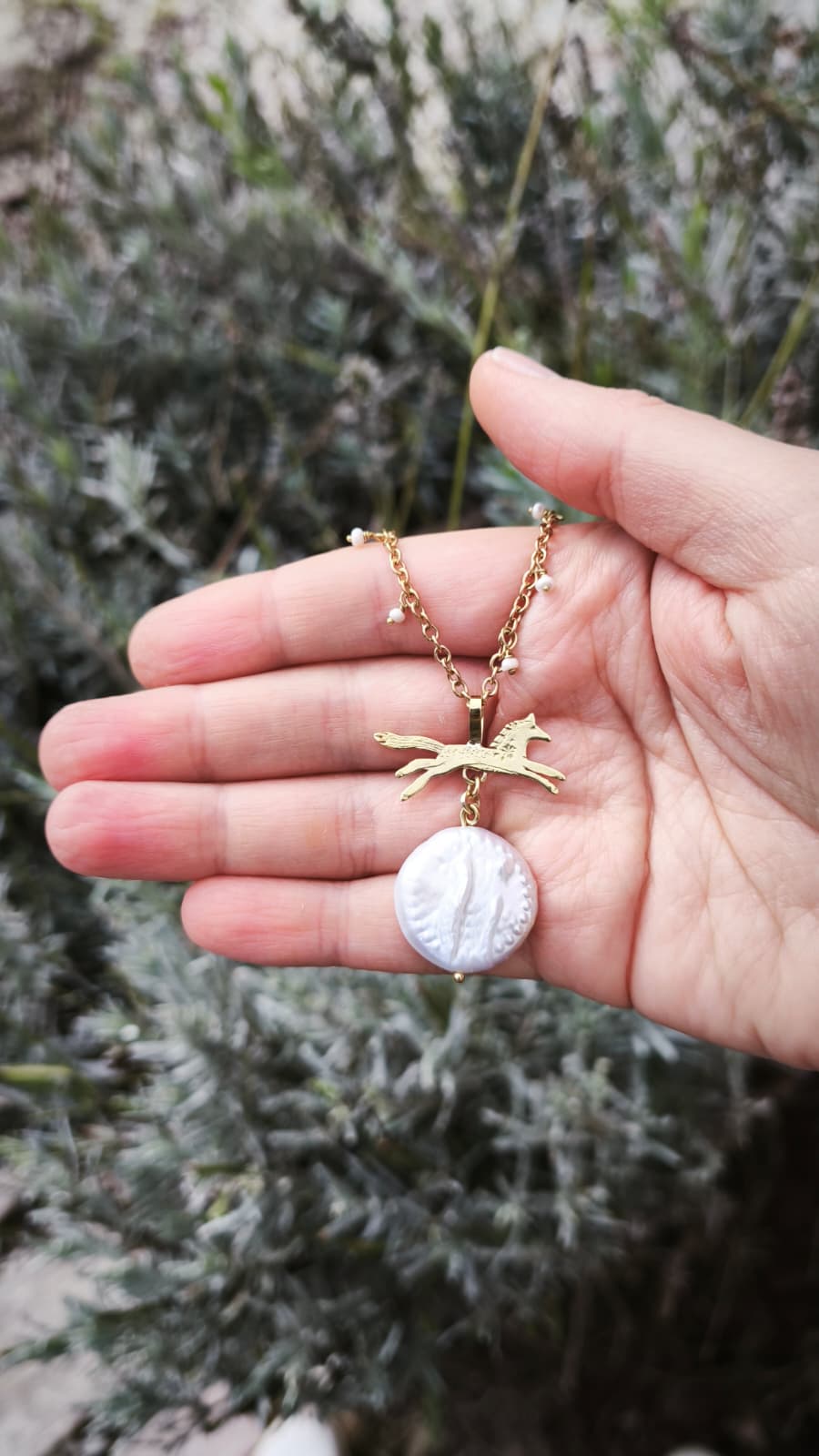 “Cavallino della Luna Piena” – Amuleto in Ottone e Perle di Fiume
