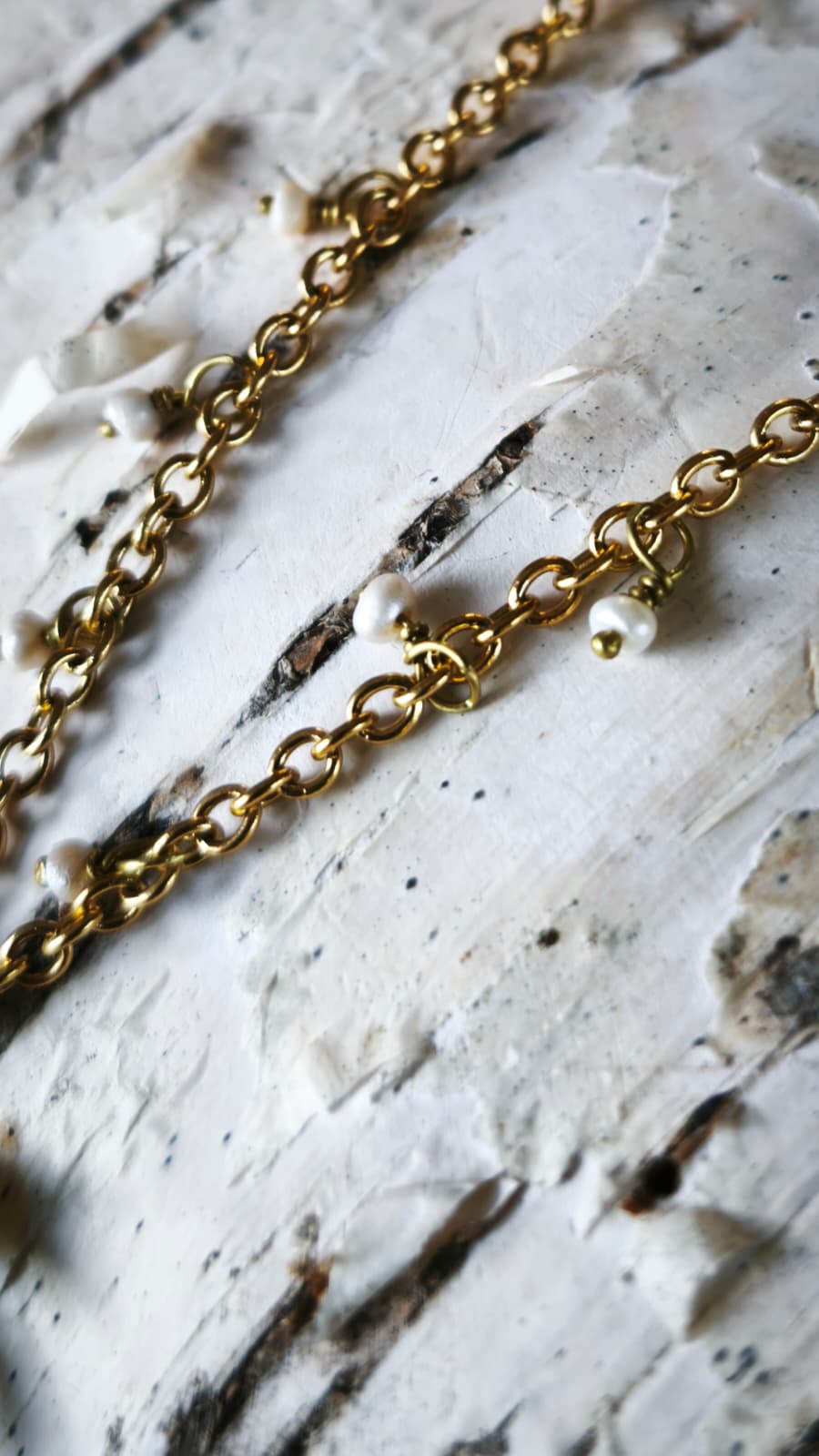 Catenina: in acciaio dorato con micro-perline di fiume; lunghezza circa 45 cm.