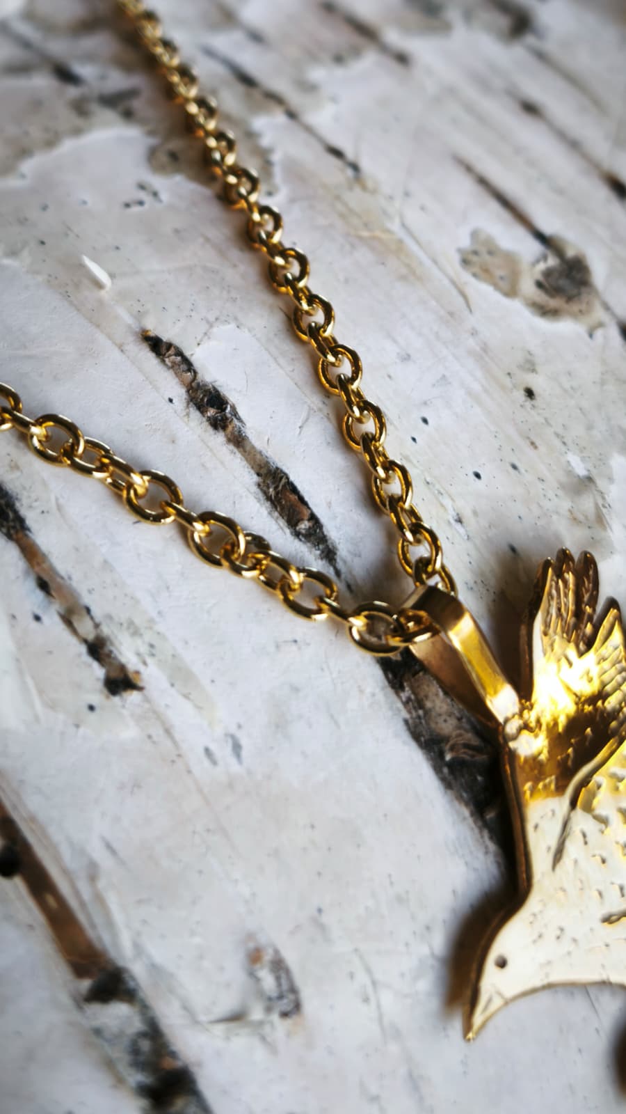 La catenina in acciaio dorato aggiunge leggerezza ed equilibrio visivo al gioiello.