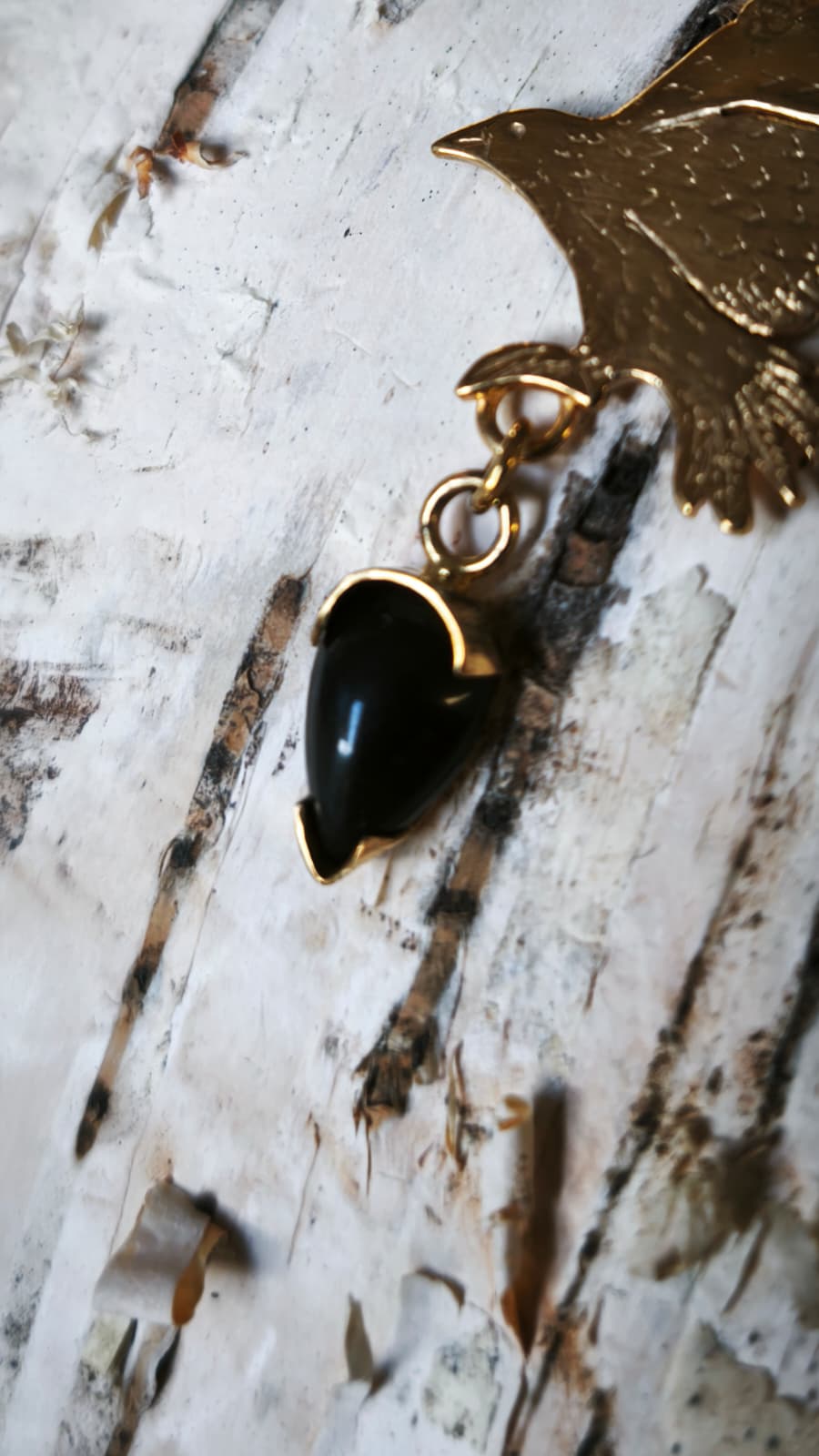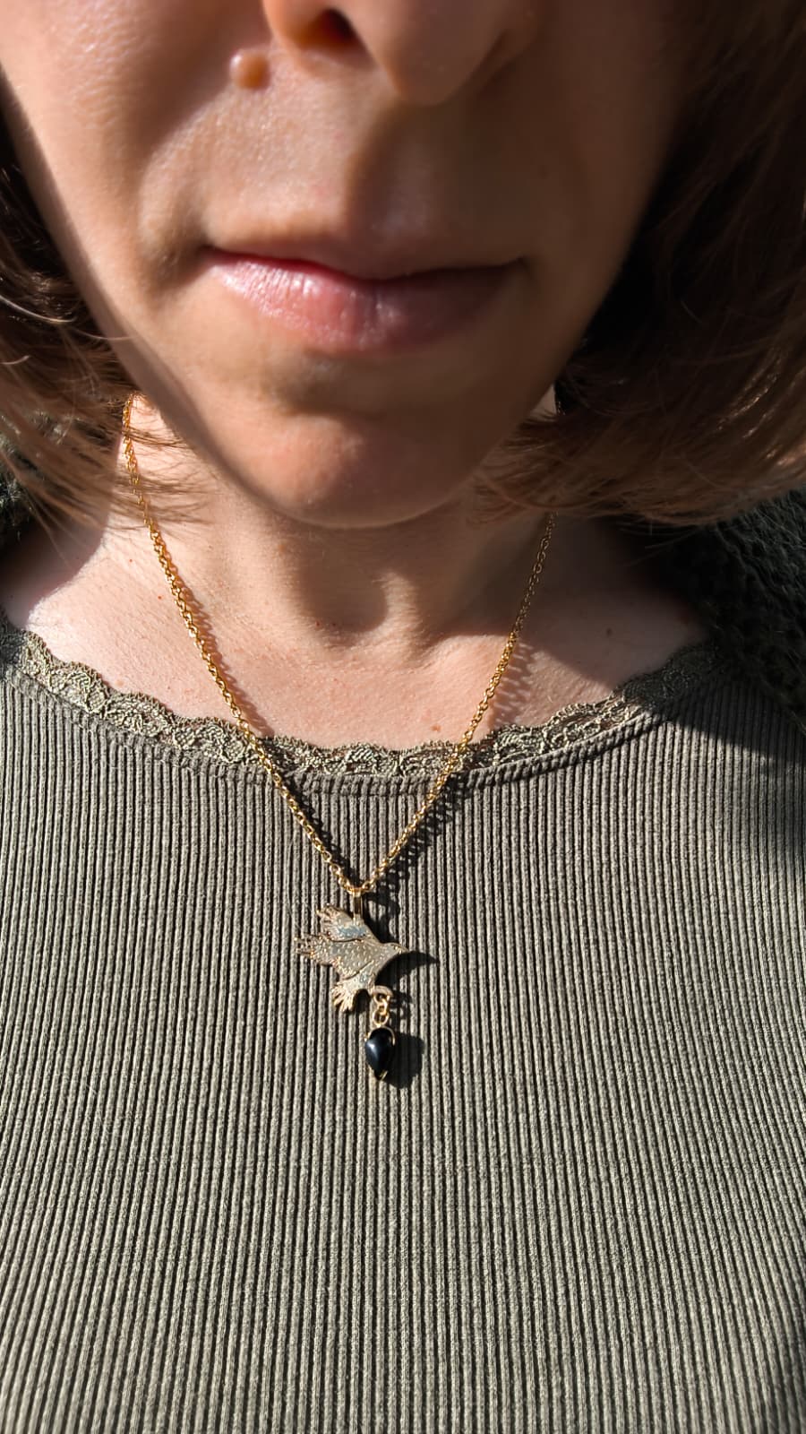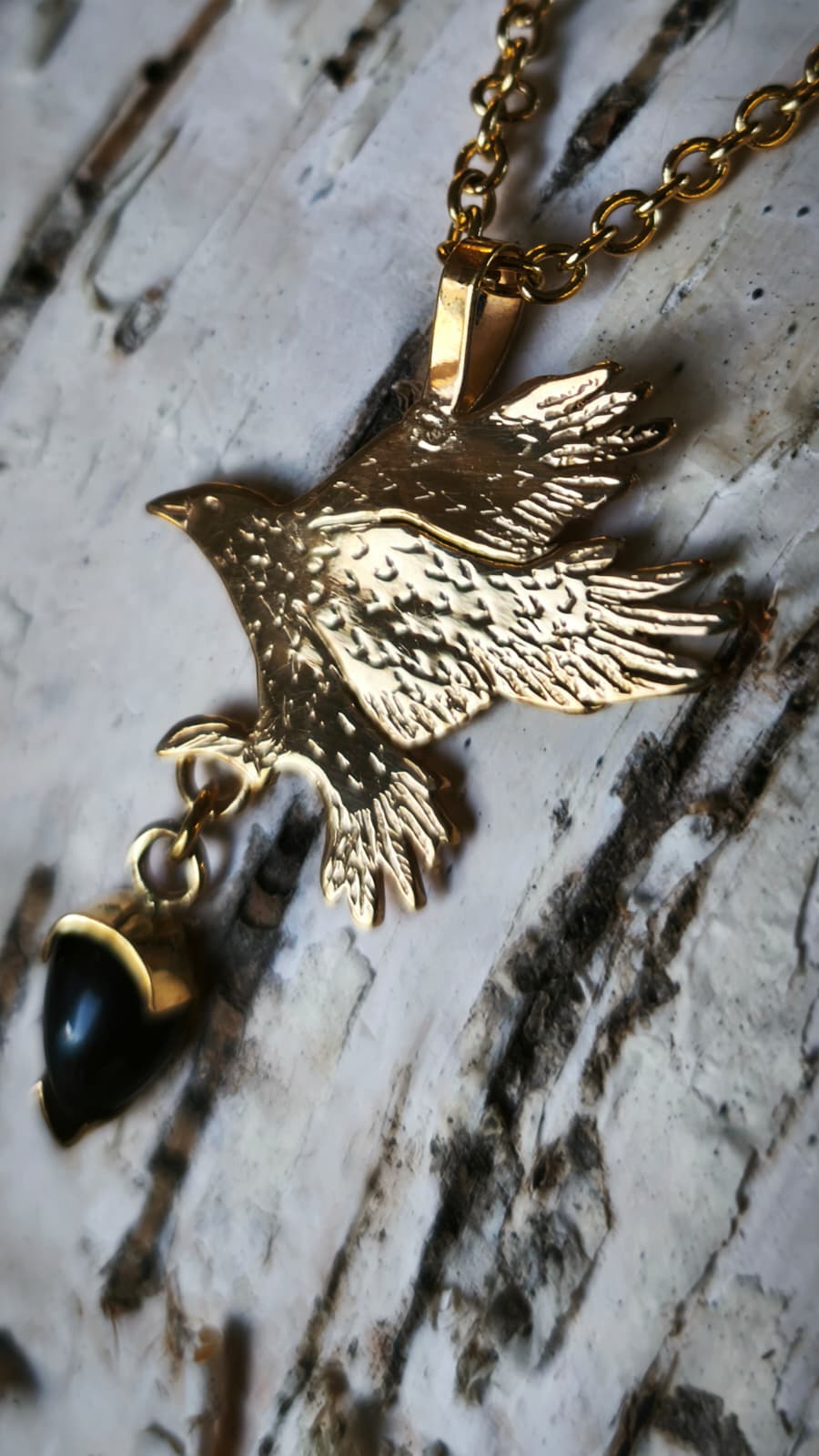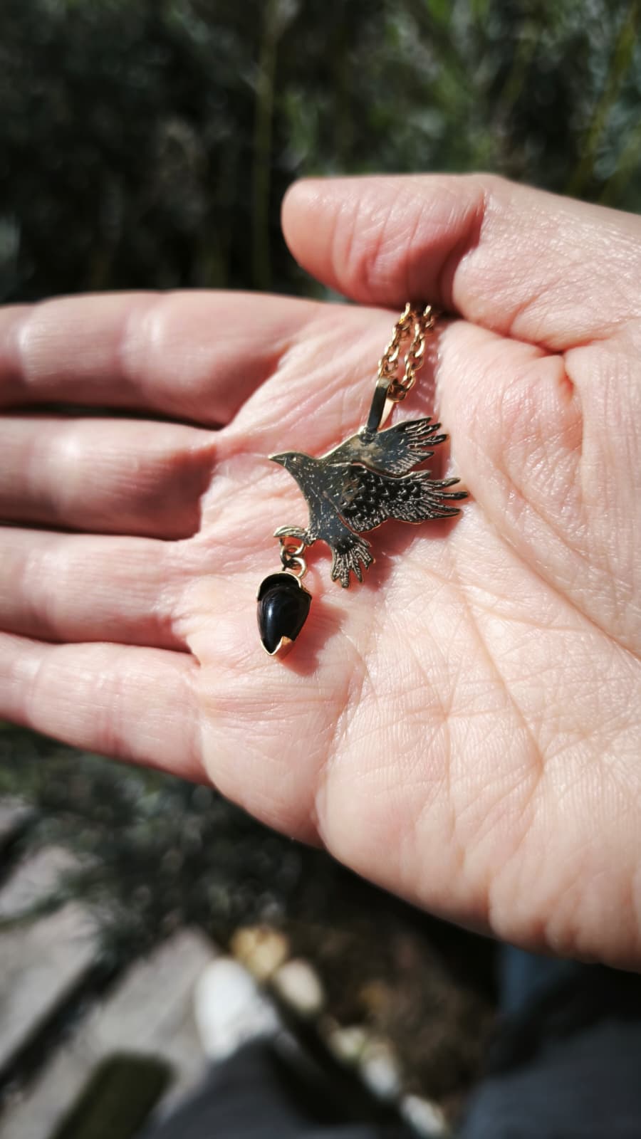 “Corvo dell'albedo” – Amuleto in ottone placcato oro 18kt e ossidiana