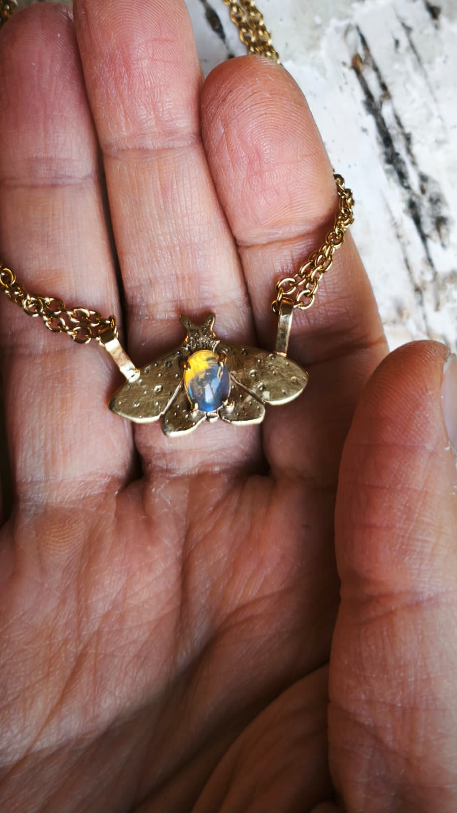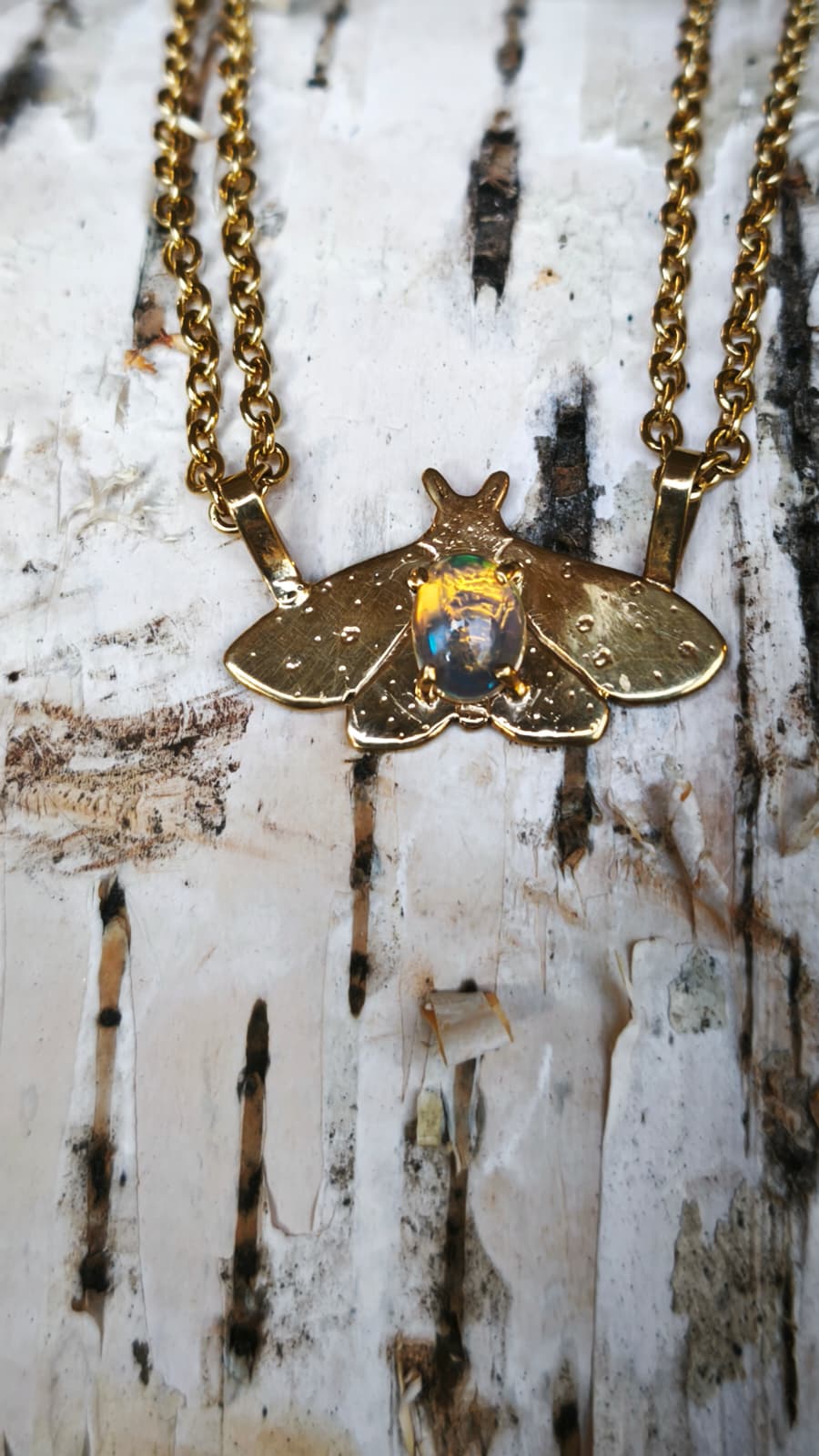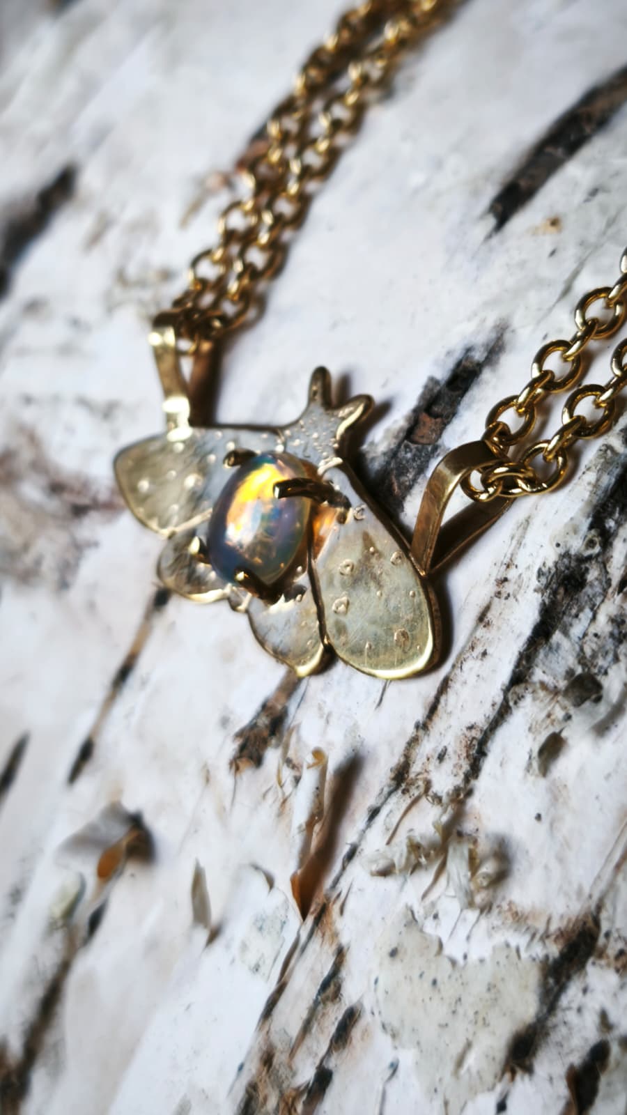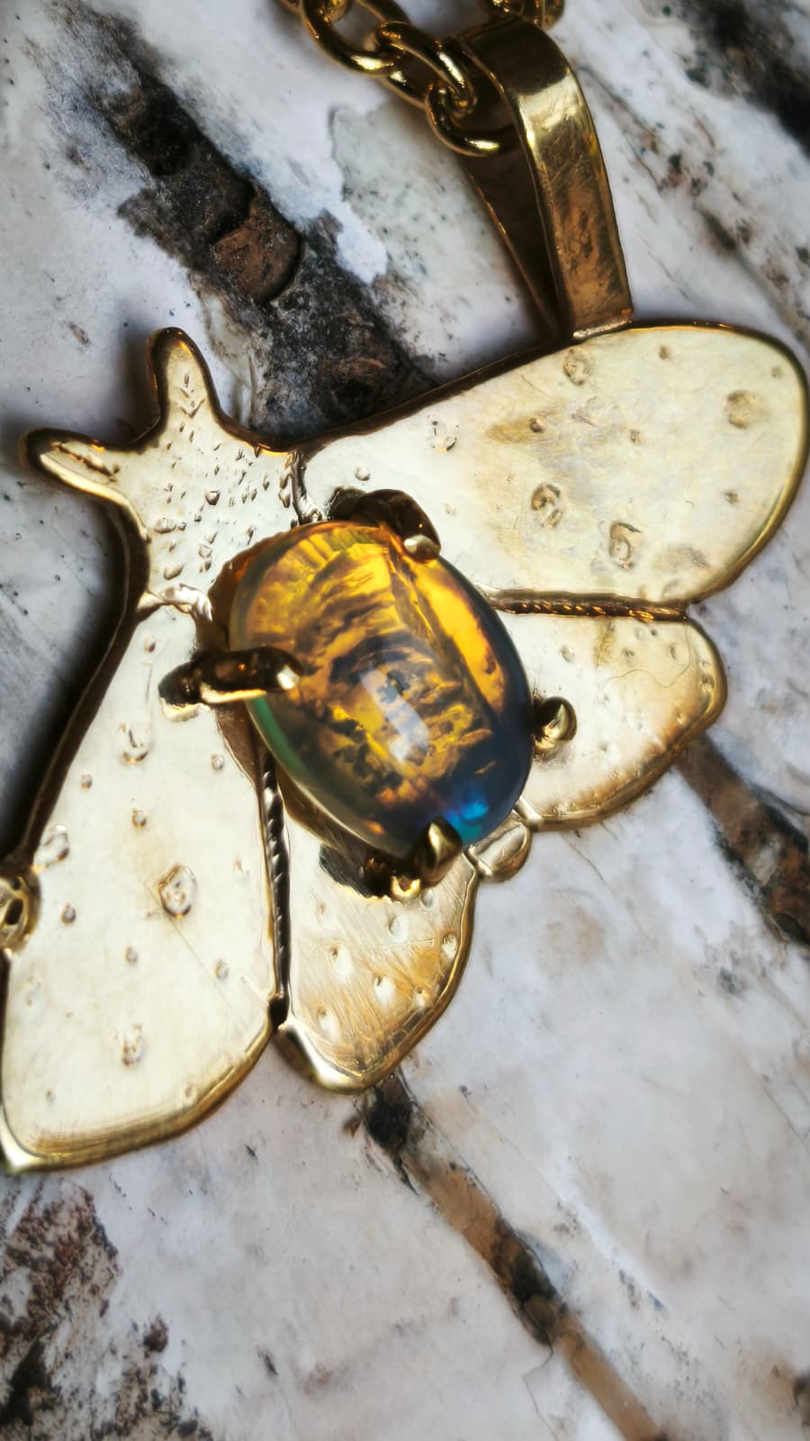 “Falena della neve” – Amuleto in ottone placcato oro 18kt e opale