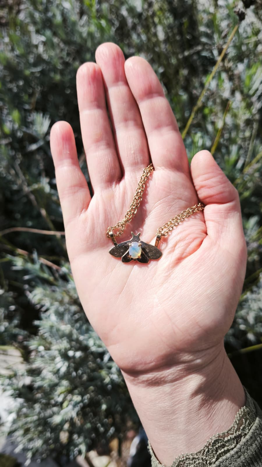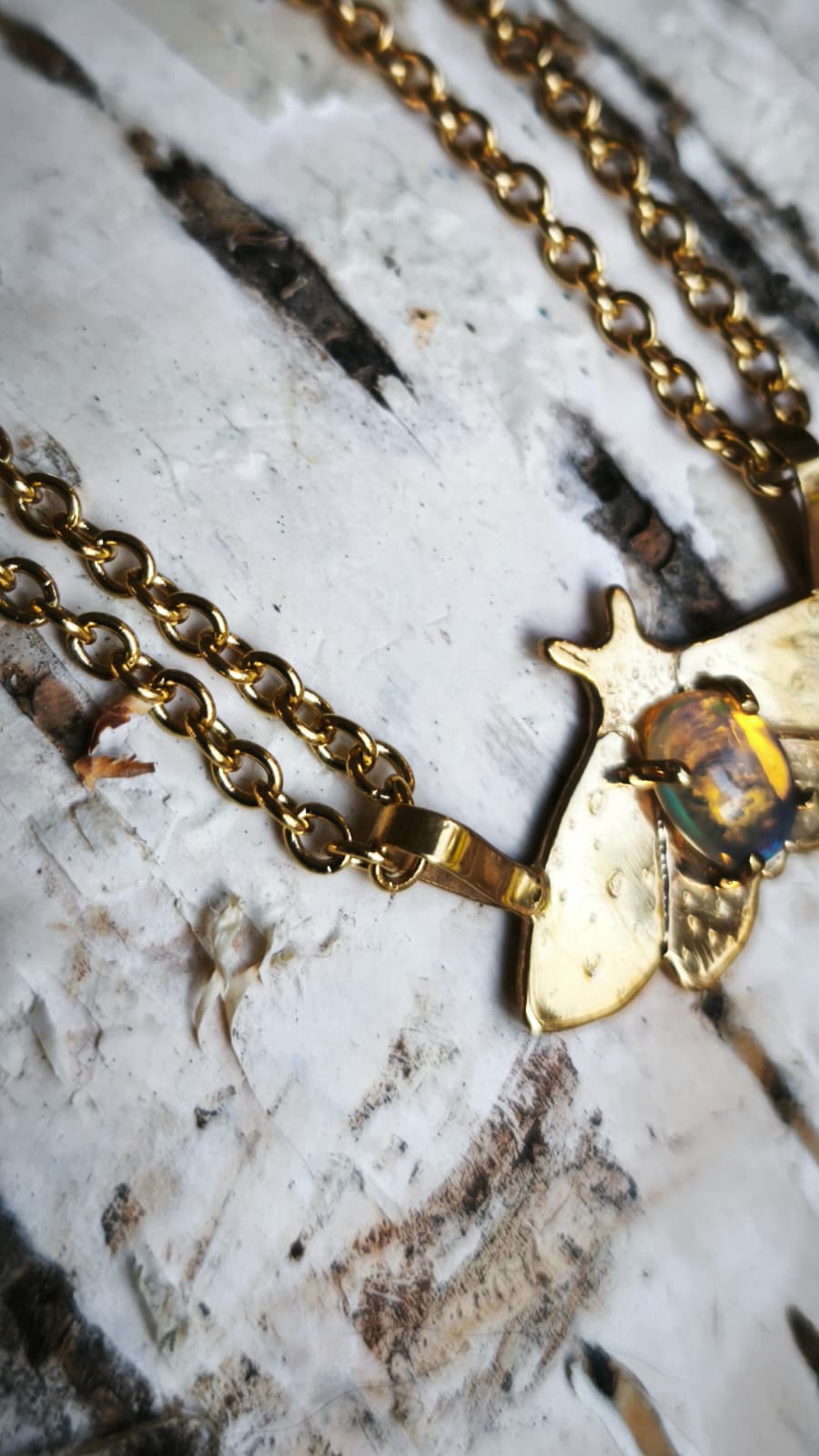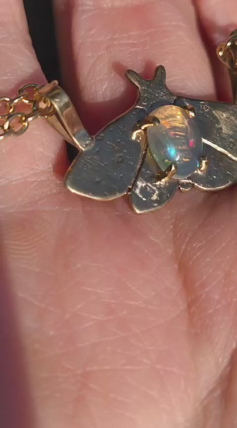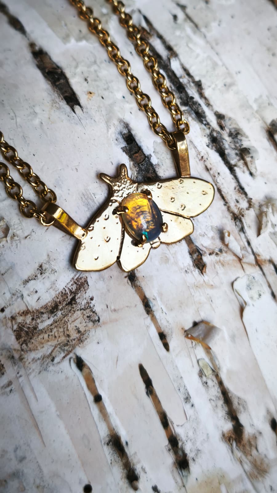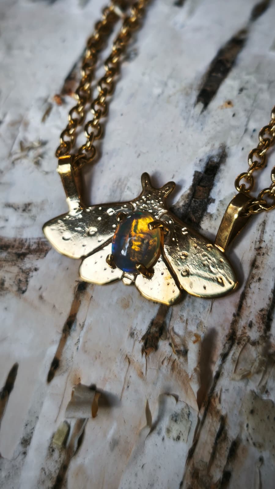 “Falena della neve” – Amuleto in ottone placcato oro 18kt e opale