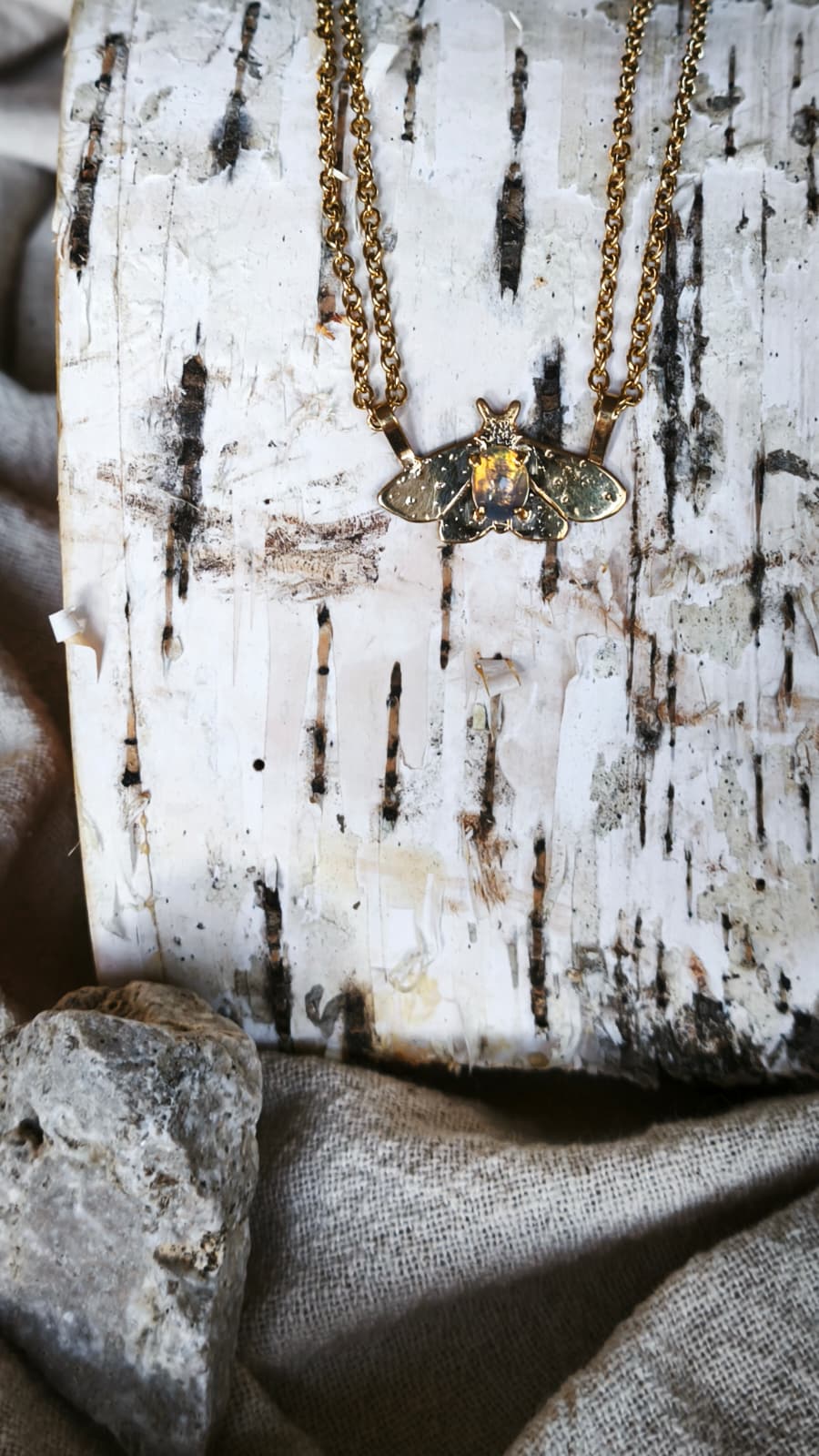Ogni dettaglio è stato realizzato con tecniche orafe tradizionali: la falena è stata traforata, incisa e saldata a mano, e infine placcata con oro 18 kt. La catenina in acciaio dorato aggiunge leggerezza ed eleganza al gioiello.