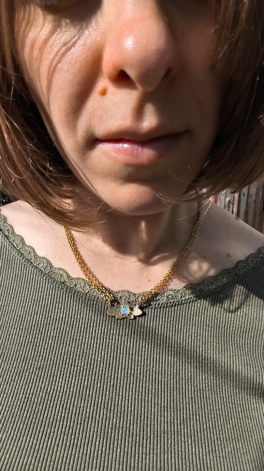 L’opale, incastonato con cura, cattura e diffonde bagliori misteriosi: una piccola costellazione da portare al collo, che amplifica l’energia metamorfica dell’amuleto.