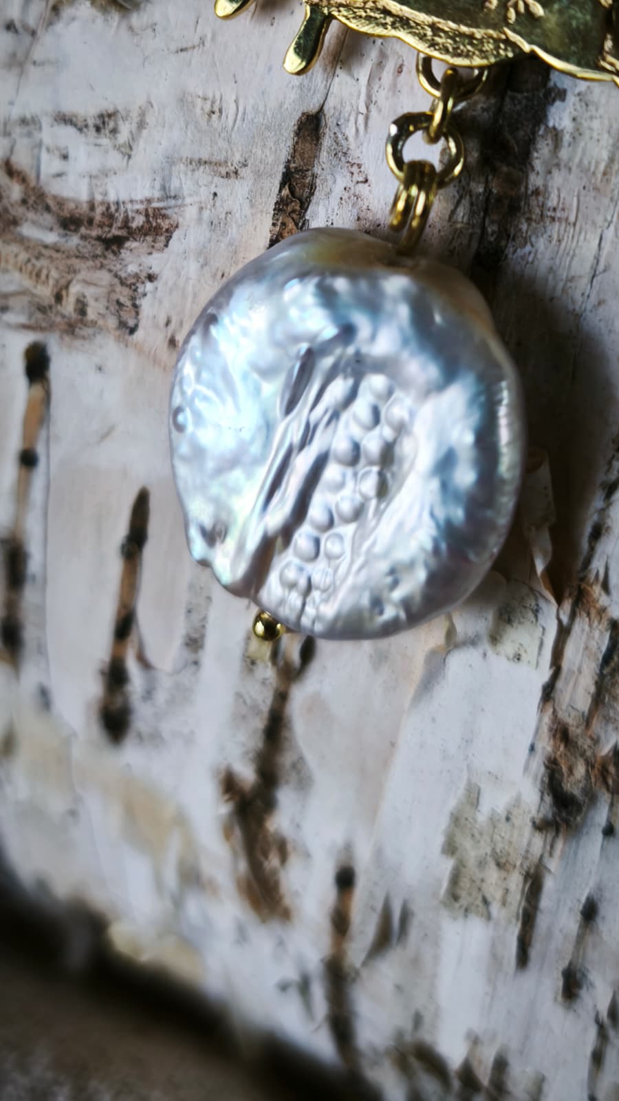 La perla di fiume barocca, naturalmente irregolare, riflette la luce con sfumature iridescenti, evocando protezione, equilibrio e legame con i cicli della natura.