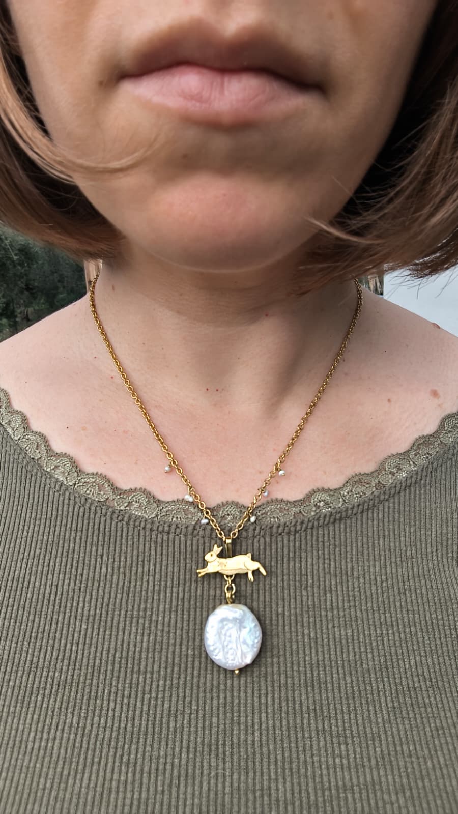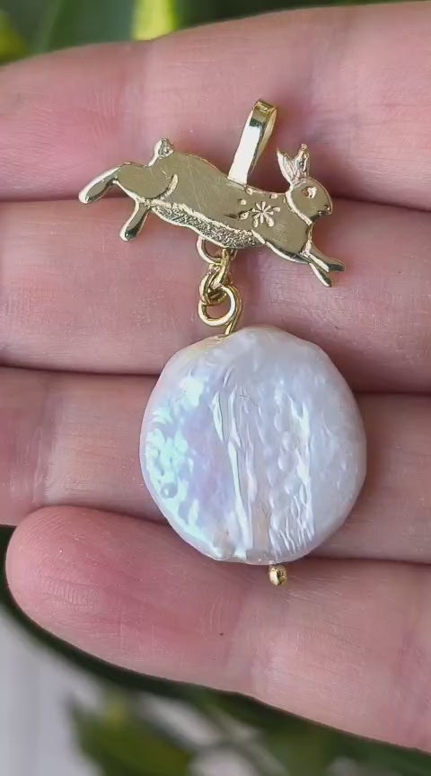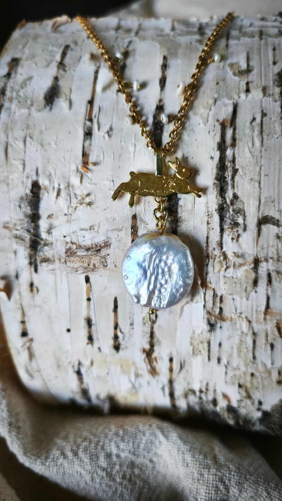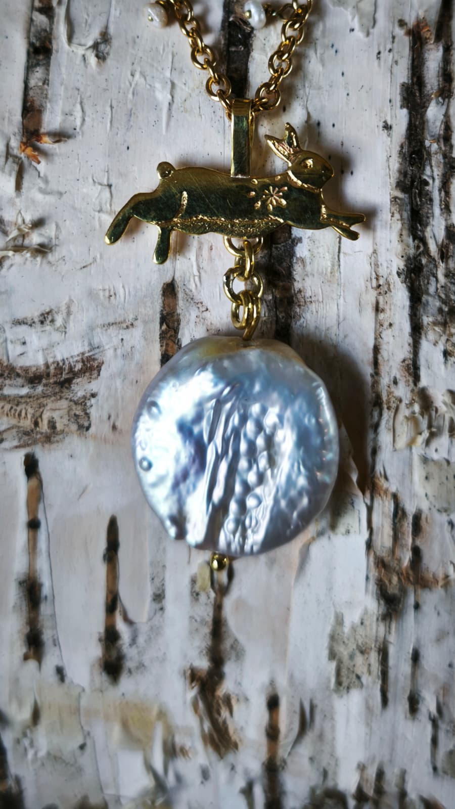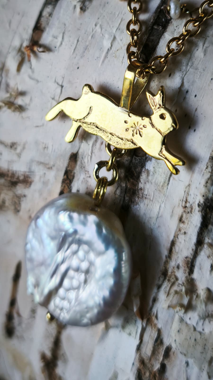 “Lepre della Luna Piena” – Amuleto in Ottone e Perle di Fiume