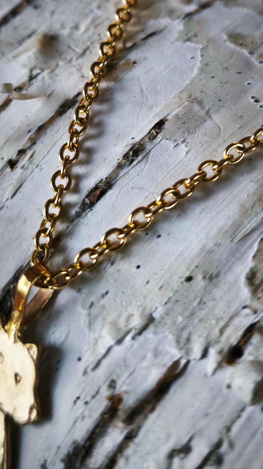 Ogni dettaglio è stato realizzato con tecniche orafe tradizionali: l’Orso è stato traforato, inciso e saldato a mano, e infine placcato con oro 18 kt. La catenina in acciaio dorato aggiunge leggerezza ed equilibrio visivo al gioiello.