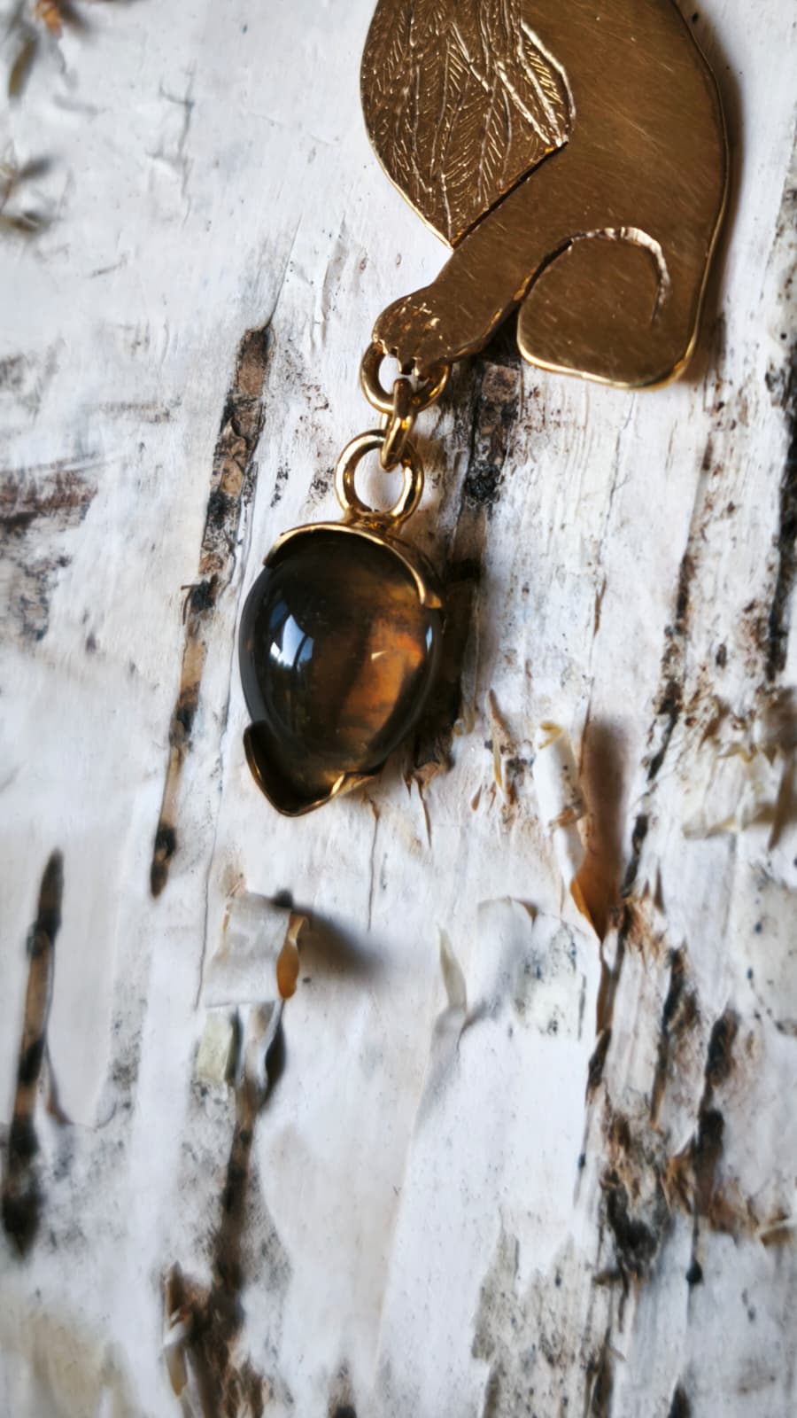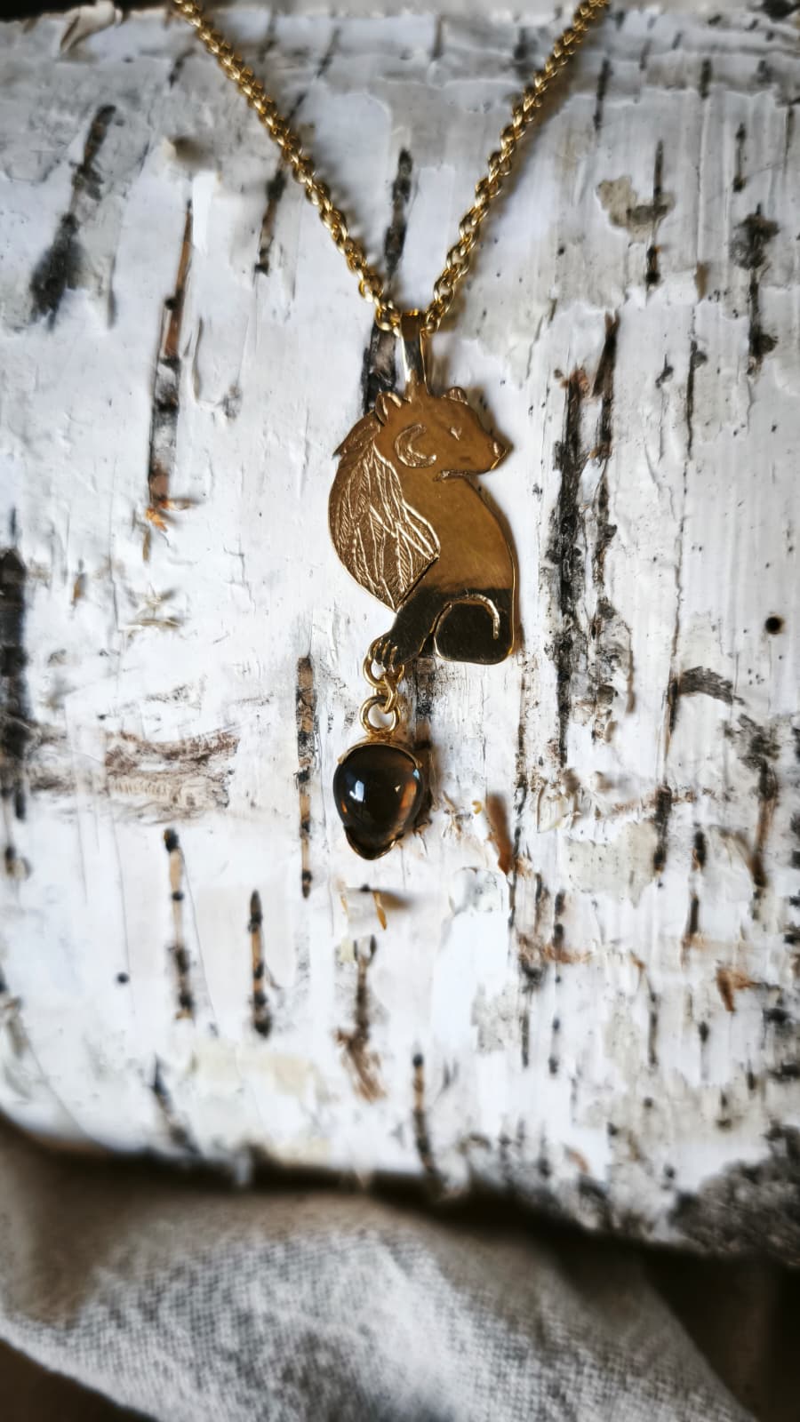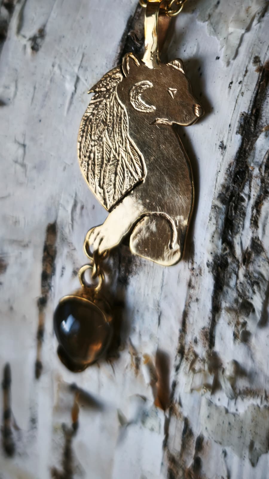 “Orso del sonno sacro” – Amuleto in ottone placcato oro 18kt e quarzo fumè